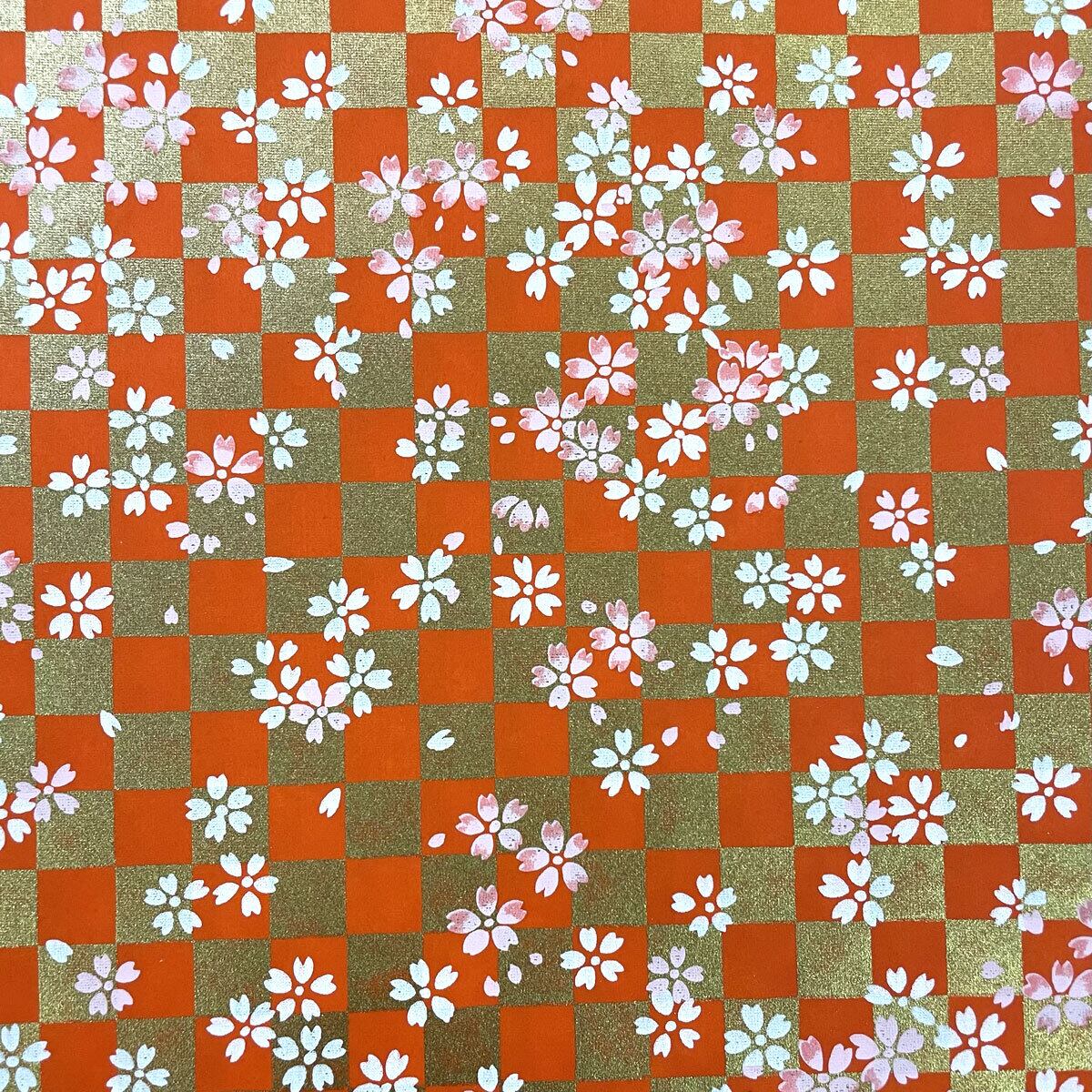 華やかな友禅和紙 金市松に桜ちらし 朱色 青 紺 オレンジ色 橙色 大判 菊判 約63x93cm 千代紙