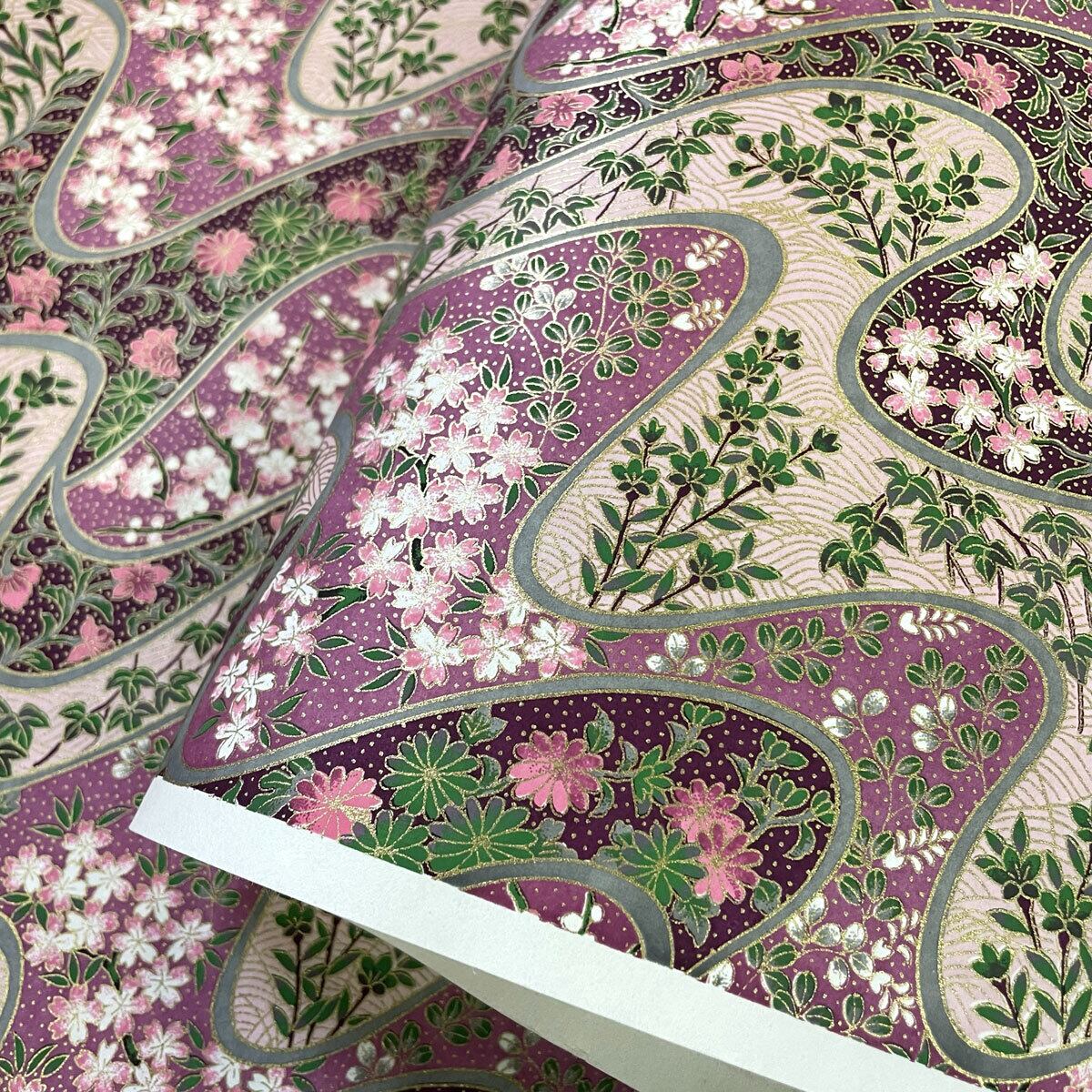 友禅和紙 華やか 流水紋に季節の花々 紫 藤色 大判 菊判 約63x93cm 千代紙 YUZEN dyeing