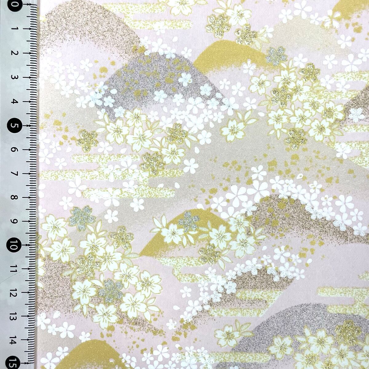 華やかな友禅紙 桜咲く山々 金の雲紋様 パール 桃色 ピンク 大判 菊判 約63x93cm YUZEN dyeing