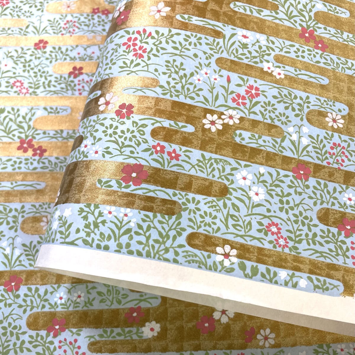 友禅和紙 金の雲紋様 朽木形 桜と小花 水色 ブルー 大判 菊判 約63x93cm 千代紙 Yuzen Dyeing
