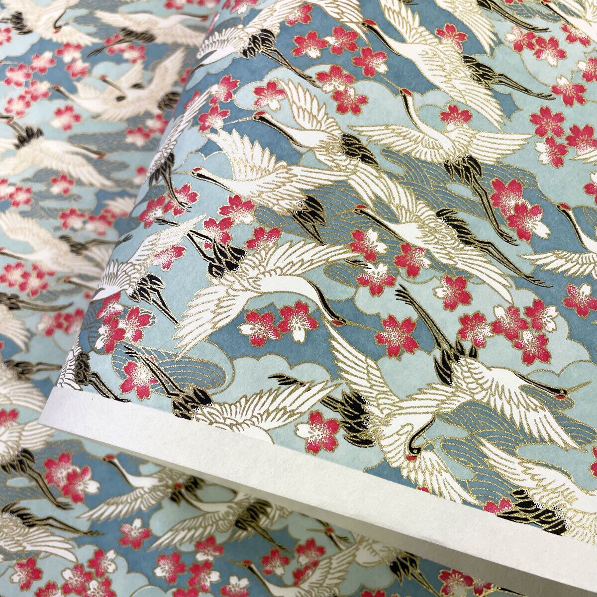 友禅和紙 華やか 羽ばたく鶴と桜 水色 ブルー 大判 菊判 約63x93cm 千代紙 YUZEN dyeing