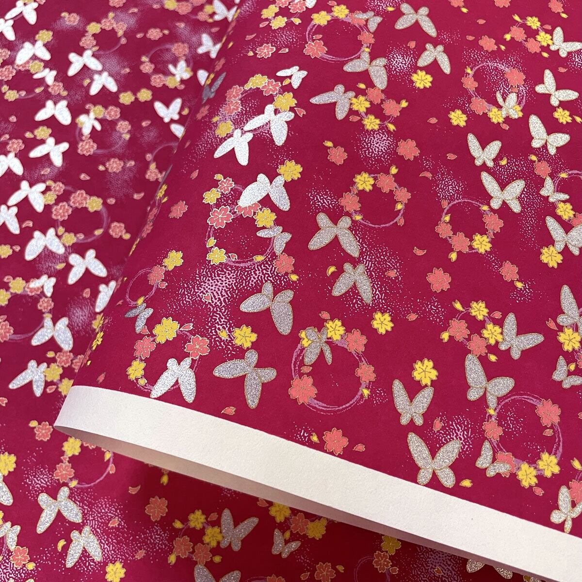 友禅和紙 可愛い蝶々と桜の花輪 紅赤 大判 菊判 約63x93cm 千代紙 Yuzen Dyeing