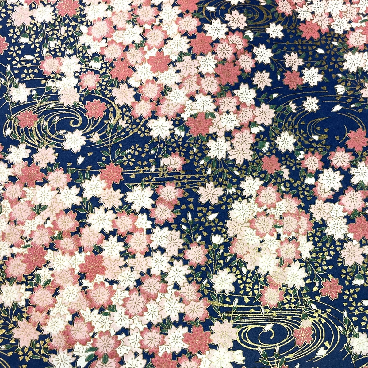 華やかな友禅紙 金の水面に淡いピンクの桜 くすみ青地 大判 菊判 約63x93cm 千代紙 YUZEN dyeing