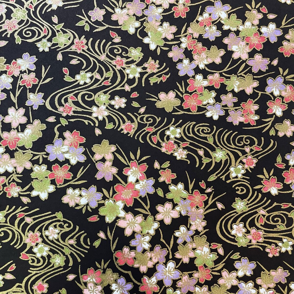 友禅和紙 黒地に春色の桜と波 大判 菊判 約63x93cm 千代紙 YUZEN dyeing