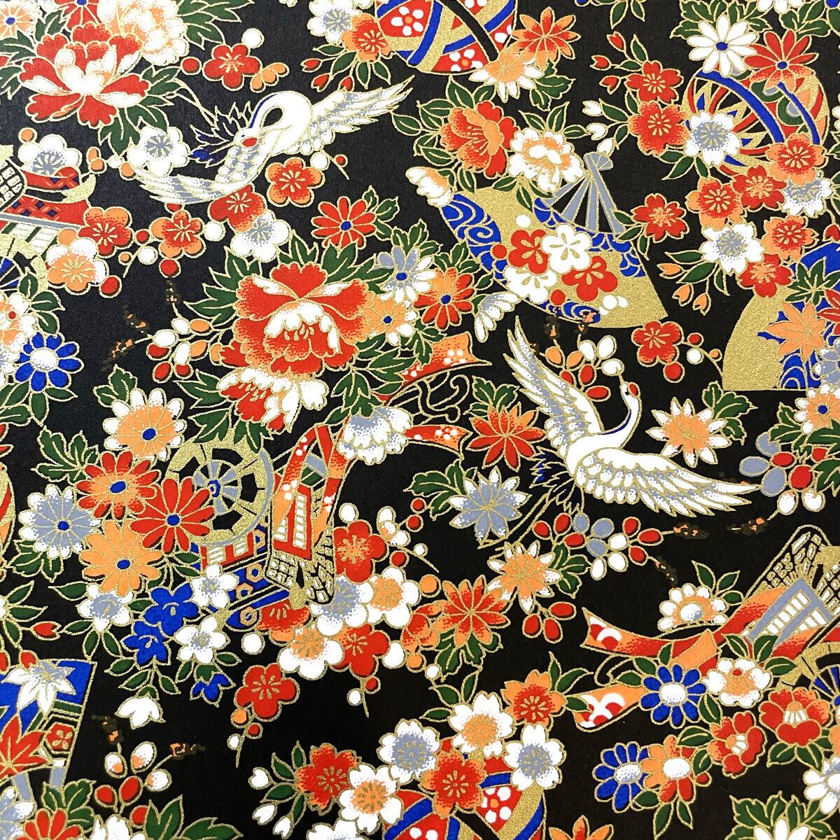 友禅和紙 豪華 鶴と扇 御所車 古典柄 牡丹 桜 黒 大判 菊判 約63x93cm 千代紙 Yuzen Dyeing
