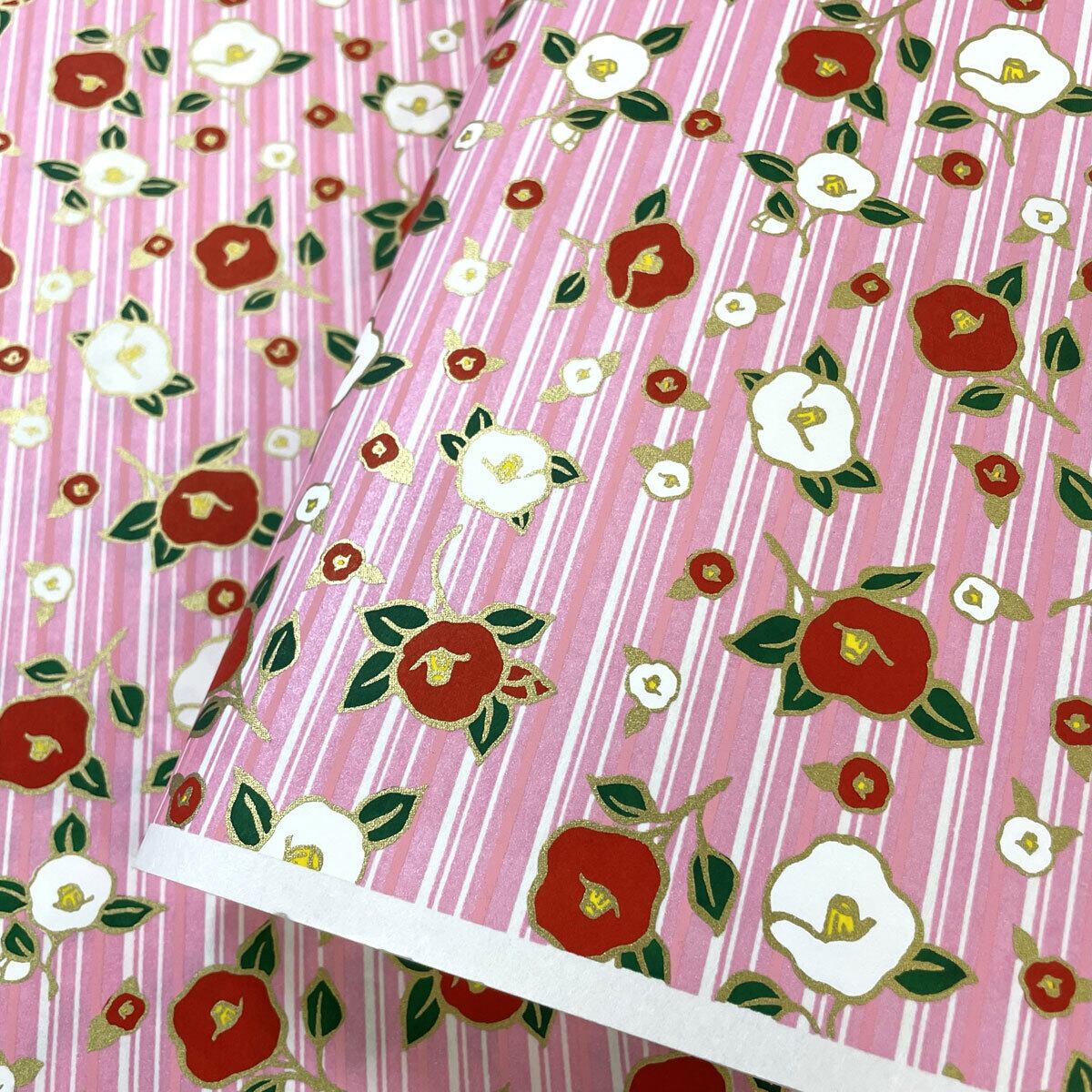 華やかな友禅和紙 縞に赤椿と白椿 レトロモダン 黒 ピンク 桃色 大判 菊判 約63x93cm 千代紙 Yuzen Dyeing
