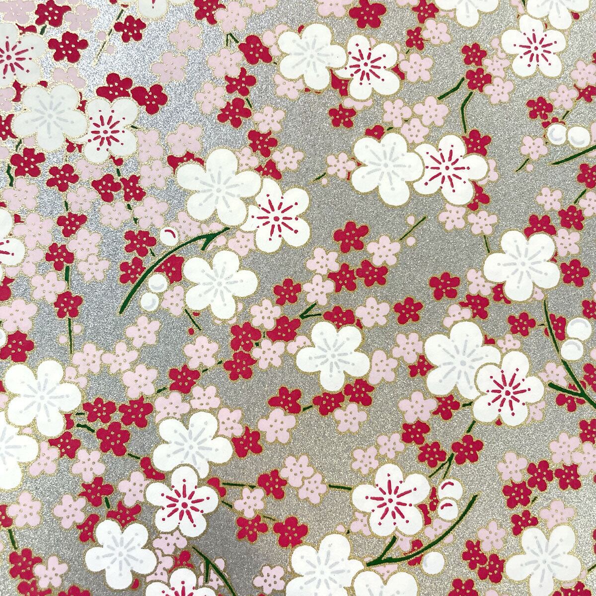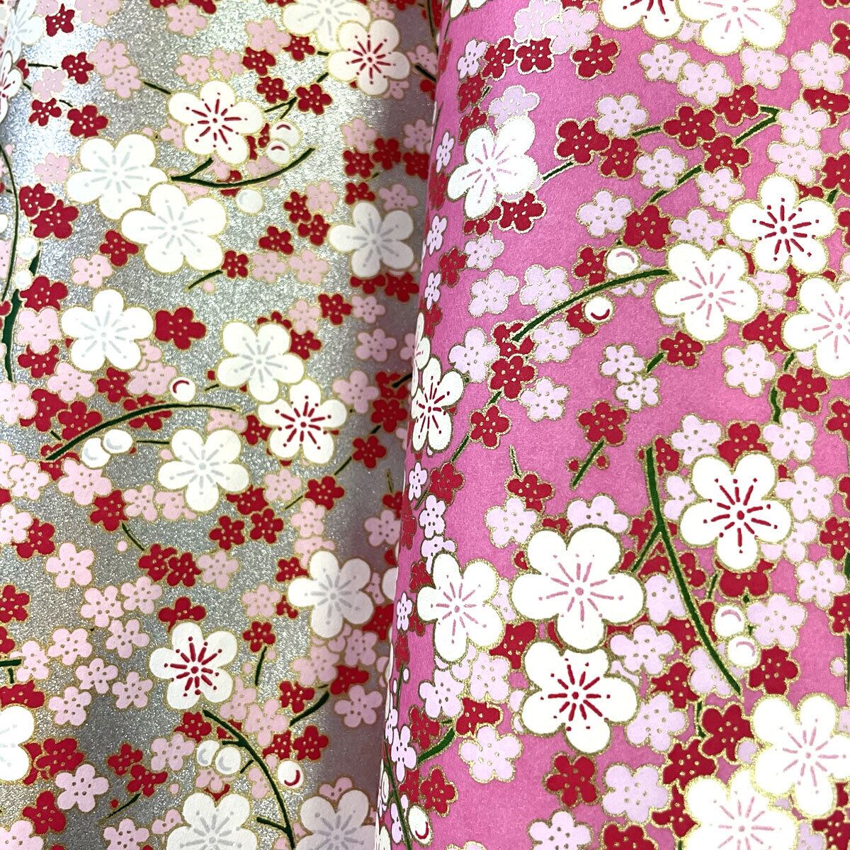 華やかな友禅和紙 紅梅 白梅 桃色 ピンク シルバー 大判 菊判 約63x93cm 千代紙 Yuzen Dyeing