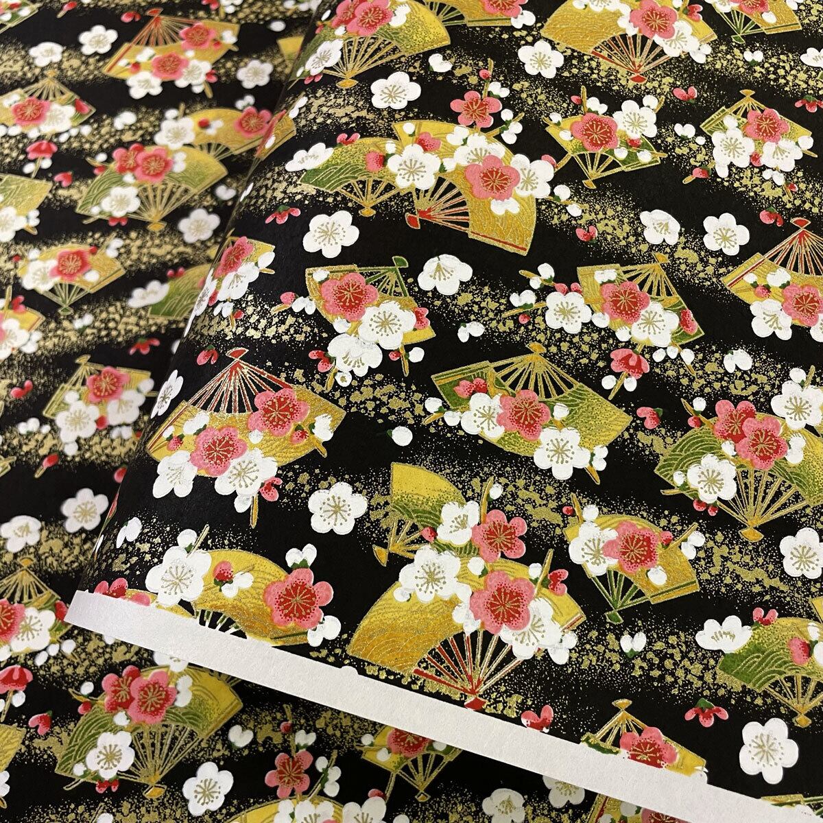 華やかな友禅和紙 扇と梅 金雲 黒地 大判 約63x93cm Yuzen Dyeing