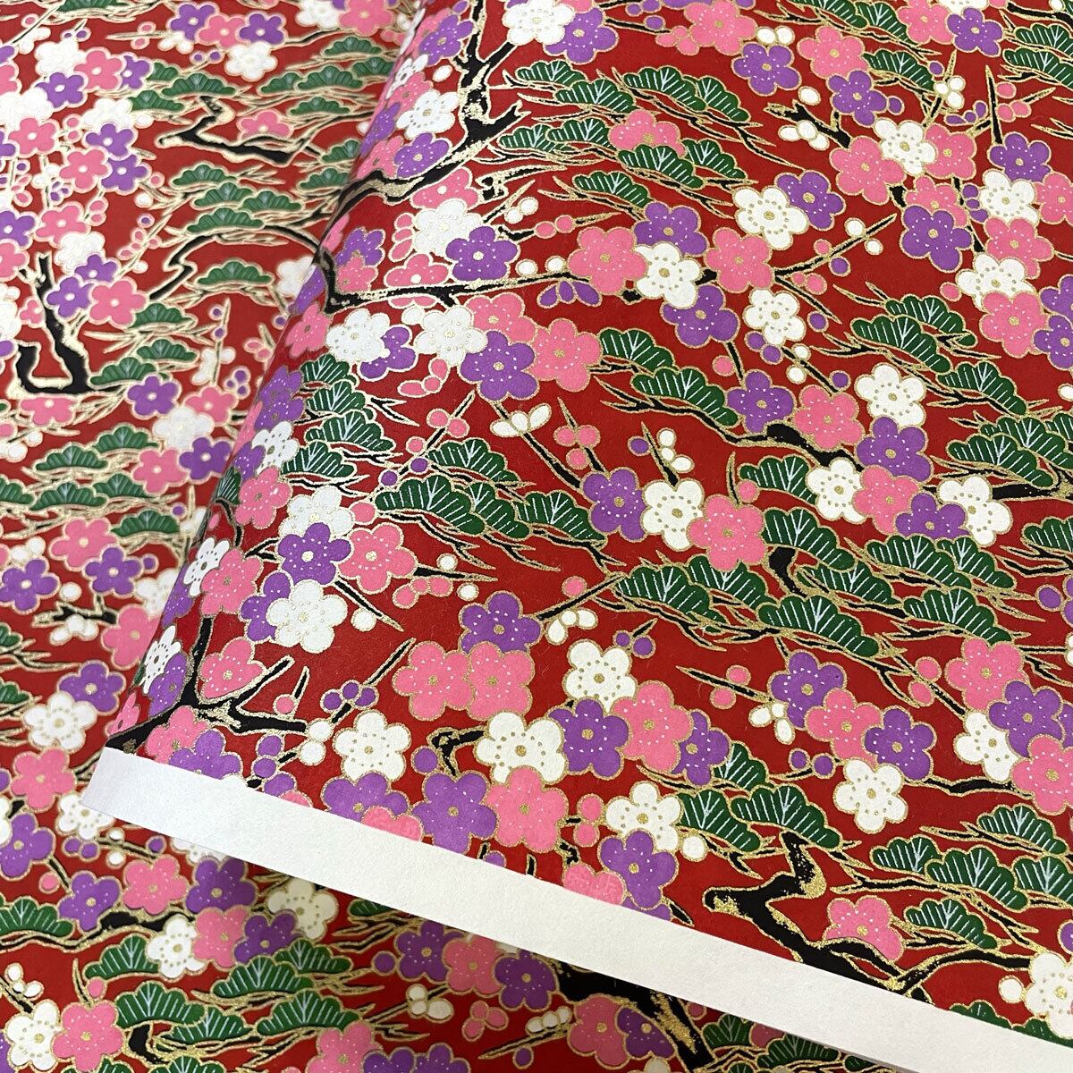 友禅和紙 華やか 梅の木 松の木 紅白梅 赤地 大判 菊判 約63x93cm 千代紙 Yuzen Dyeing