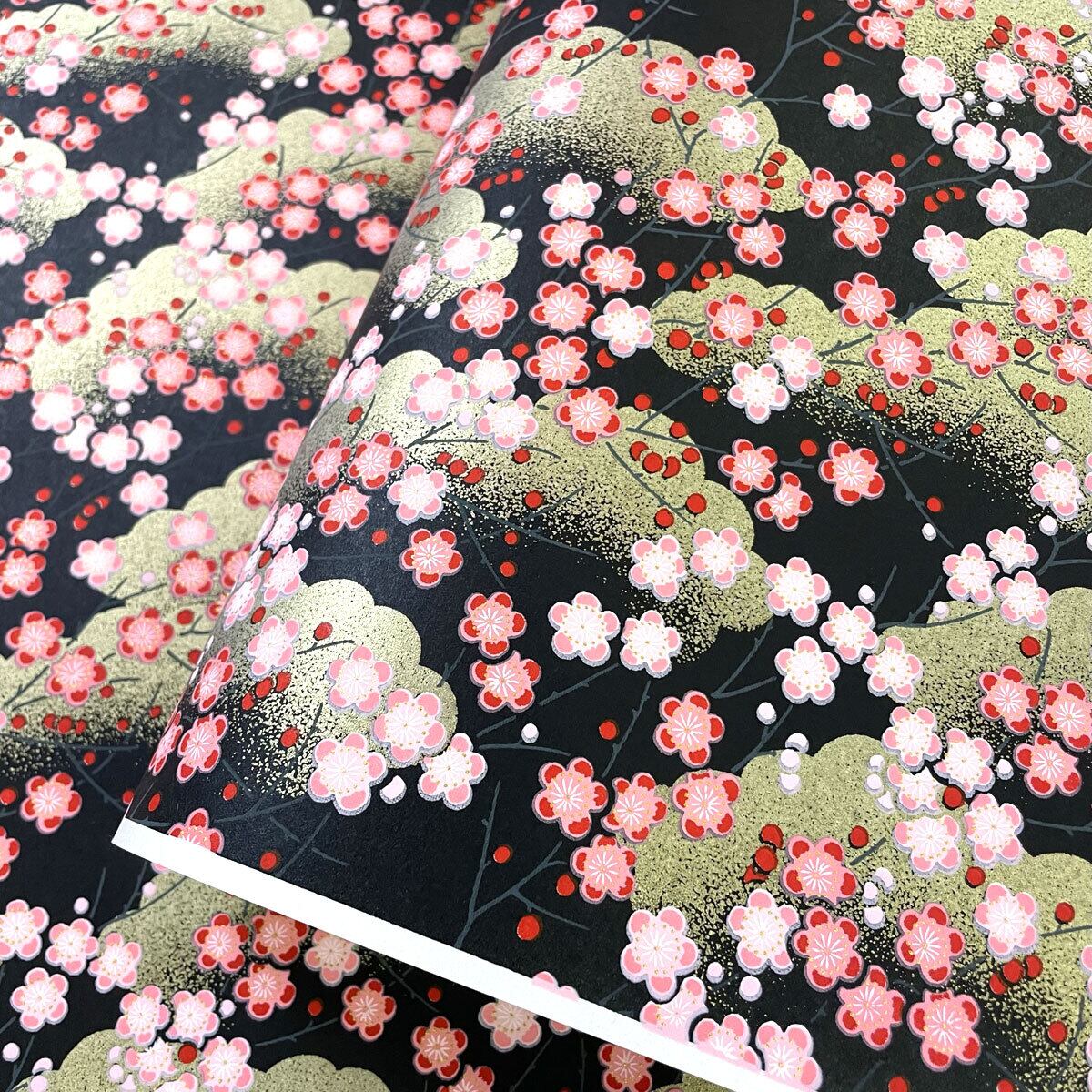 友禅和紙 華やか梅の花 金雲 黒地 菊判 大判 約63x93cm 千代紙 Yuzen Dyeing