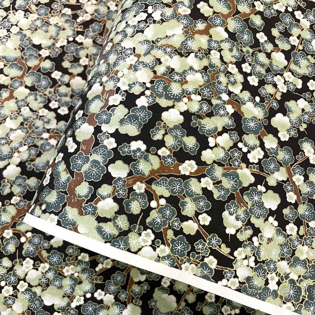 友禅和紙 黒地に緑に染めた満開の梅 梅の木 大判 菊判 約63x93cm 千代紙 YUZEN dyeing