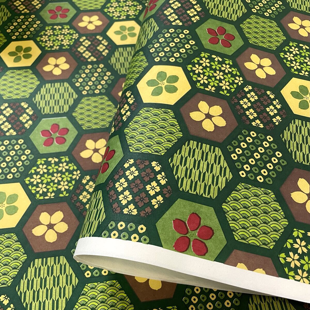 友禅和紙 ハニカム柄 六角 ハチの巣柄に古典紋様 桜 緑 大判 菊判 約63x93cm 千代紙