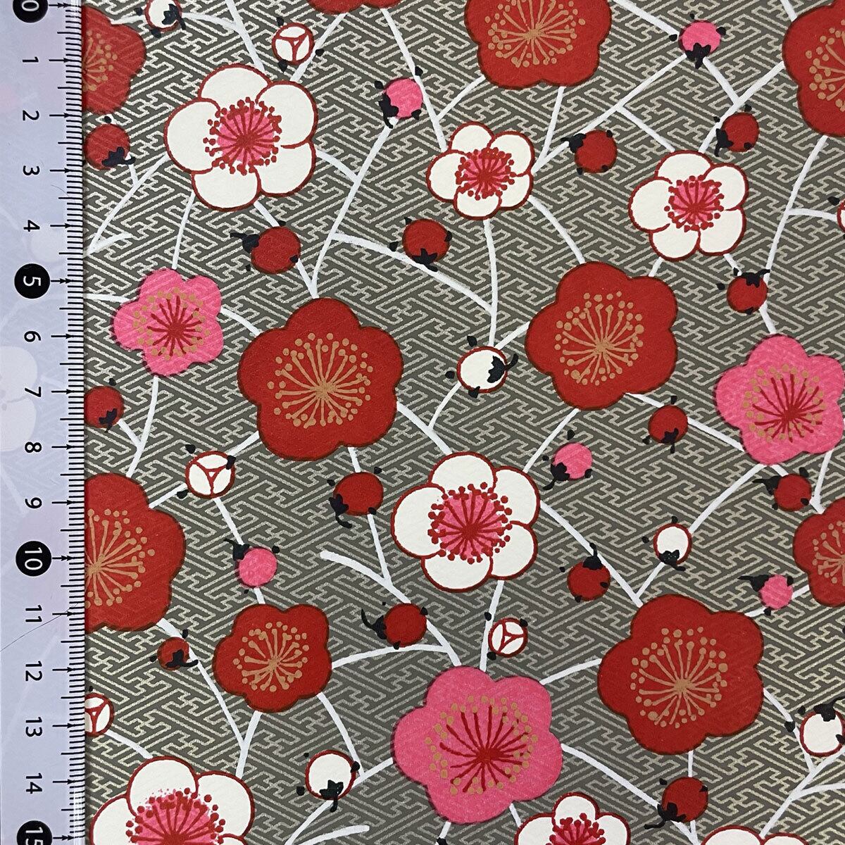 華やかな友禅和紙 紗綾形に梅の花 紅白梅 大正ロマン風 グレー系 菊判 大判 約63x93cm