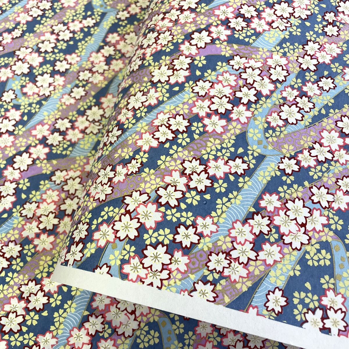華やかな友禅紙 短冊に桜ちらし 赤の縁取りの桜 青地 菊判 大判 約63x95㎝ YUZEN dyeing