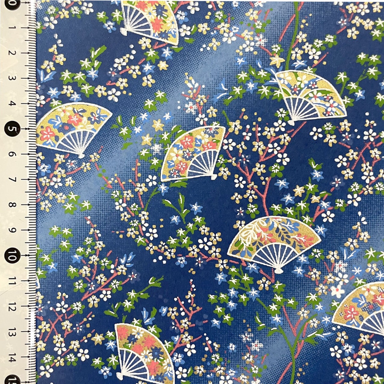 華やかな友禅和紙 小花咲く木々に扇 青 紫 大判 菊判 約63x93cm 千代紙 Yuzen Dyeing