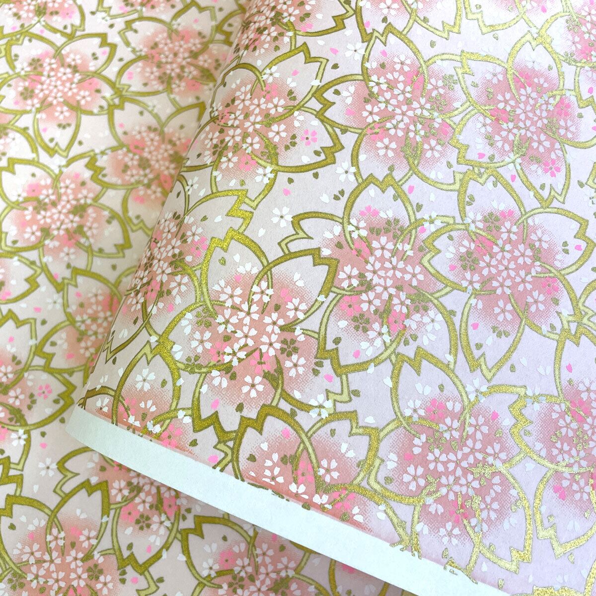 華やかな友禅和紙 大きな桜と小さな桜 金の縁取り ピンクのぼかし YUZEN dyeing 菊判 大判 約63x95㎝ 千代紙