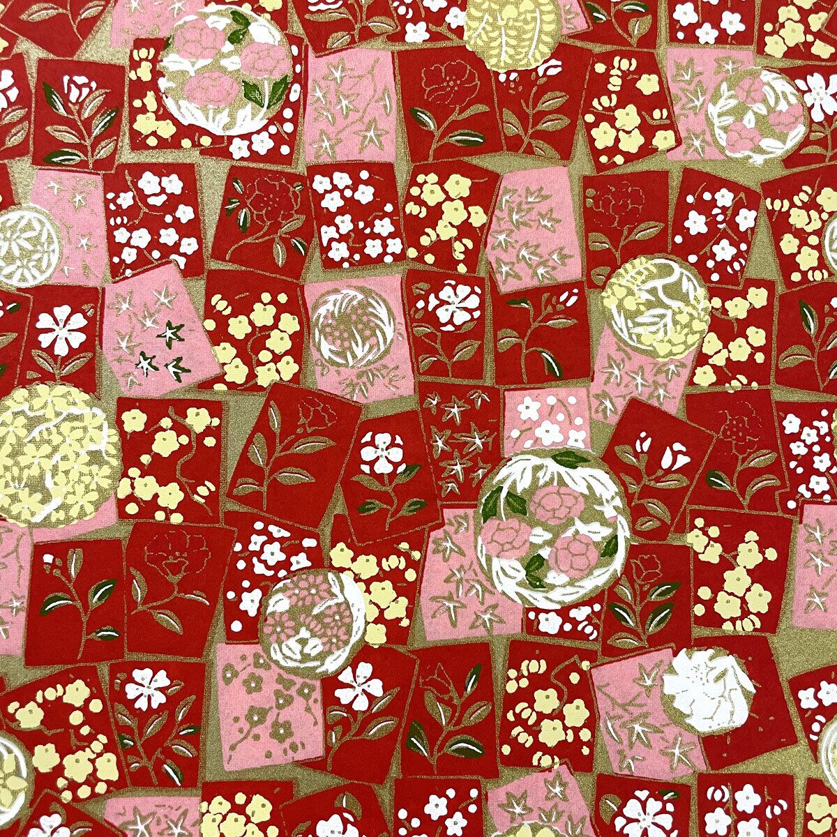 華やかな友禅和紙 小花柄のカルタと花輪 赤 YUZEN dyeing 菊判 大判 約63x95㎝ 千代紙