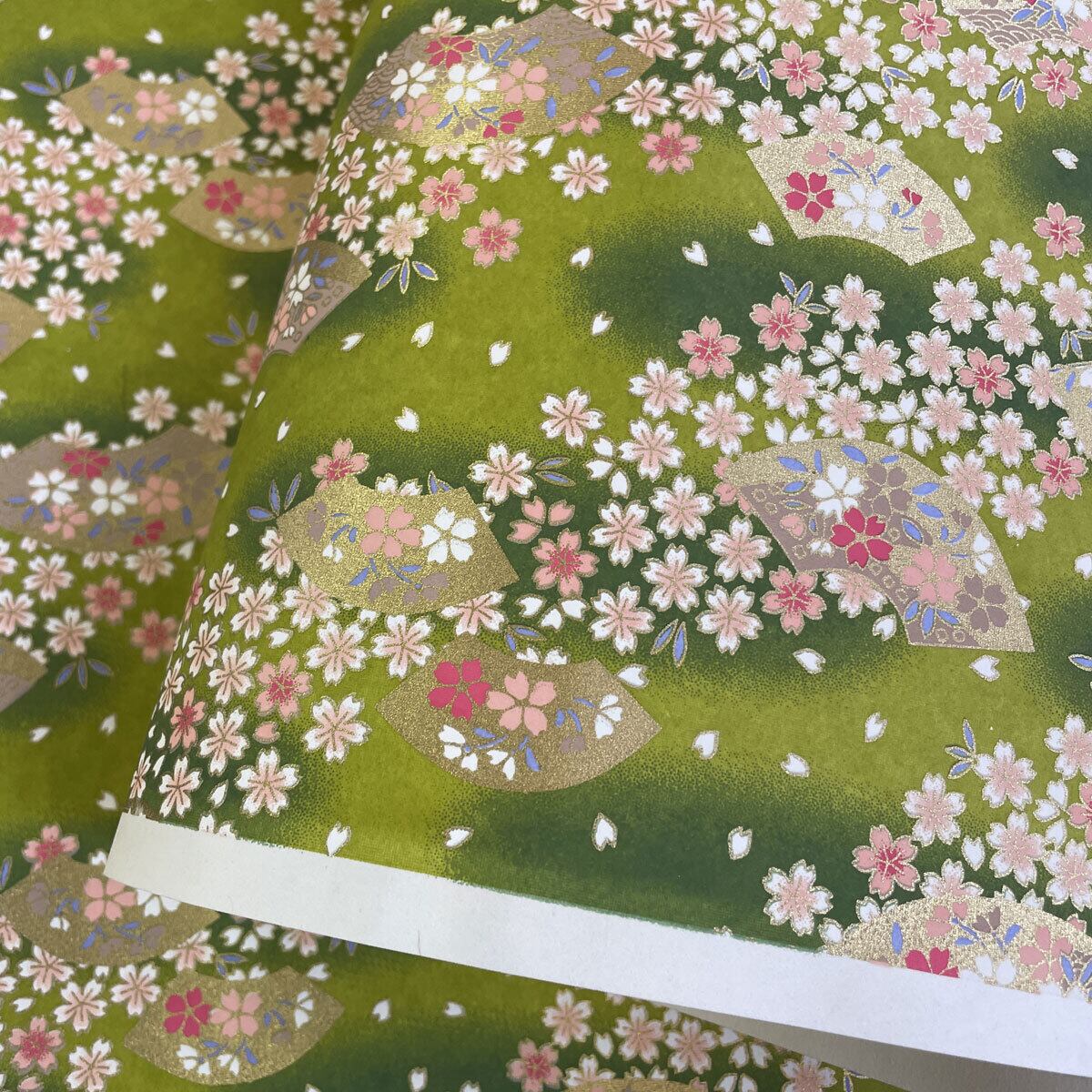 華やかな友禅紙 金扇に桜ちらし 緑 明るい黄緑 大判 菊判 約63x93cm YUZEN dyeing