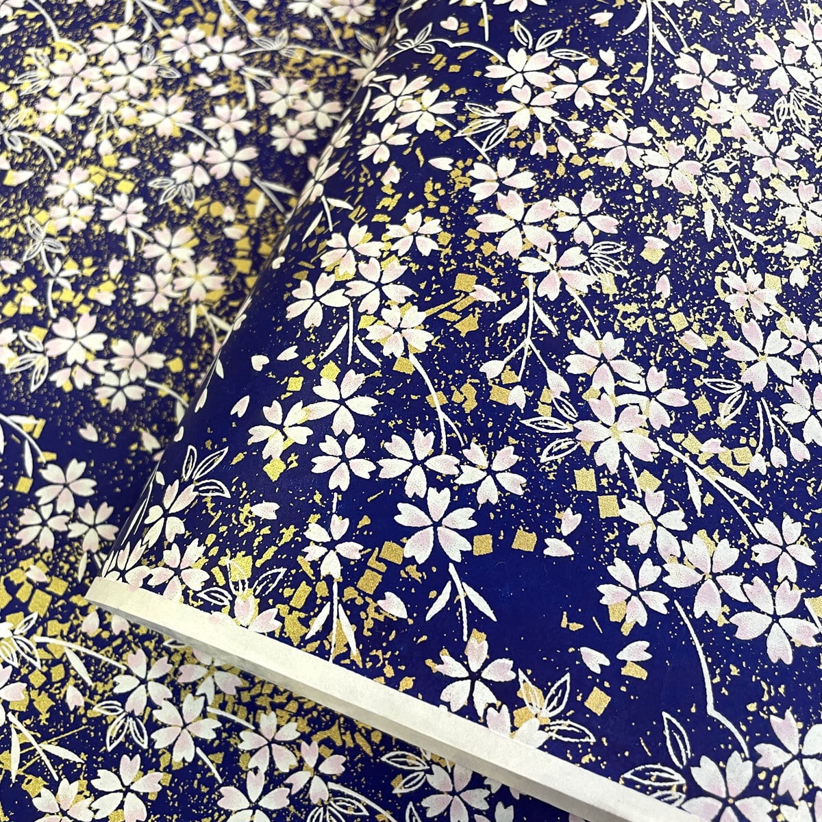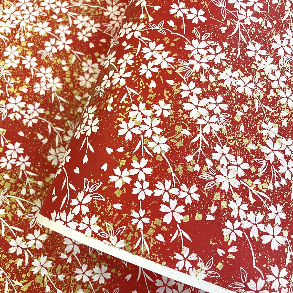 華やかな友禅和紙 金箔ちらし しだれ桜 青 赤 菊判 大判 約63 x93cm 千代紙 YUZEN dyeing