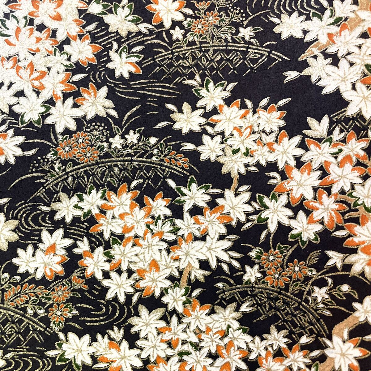 華やかな友禅和紙 紅葉 秋 もみじと水の流れ 黒地 菊判 大判 約63x93cm 千代紙 YUZEN dyeing