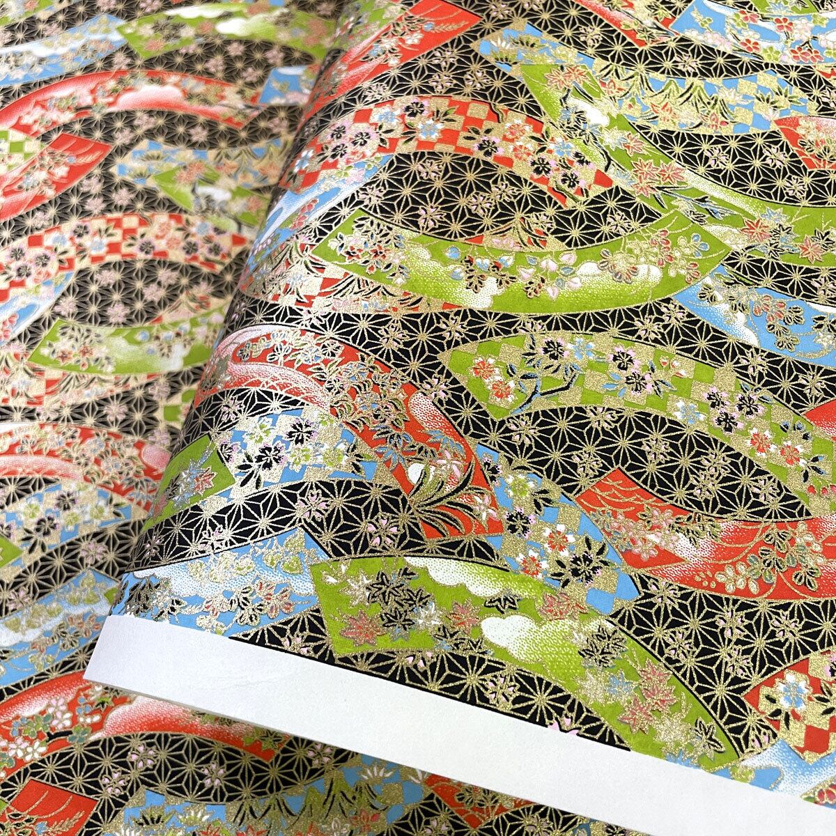 華やかな友禅和紙 黒地の麻の葉紋様に短冊 大判 菊判 約63x93cm YUZEN dyeing