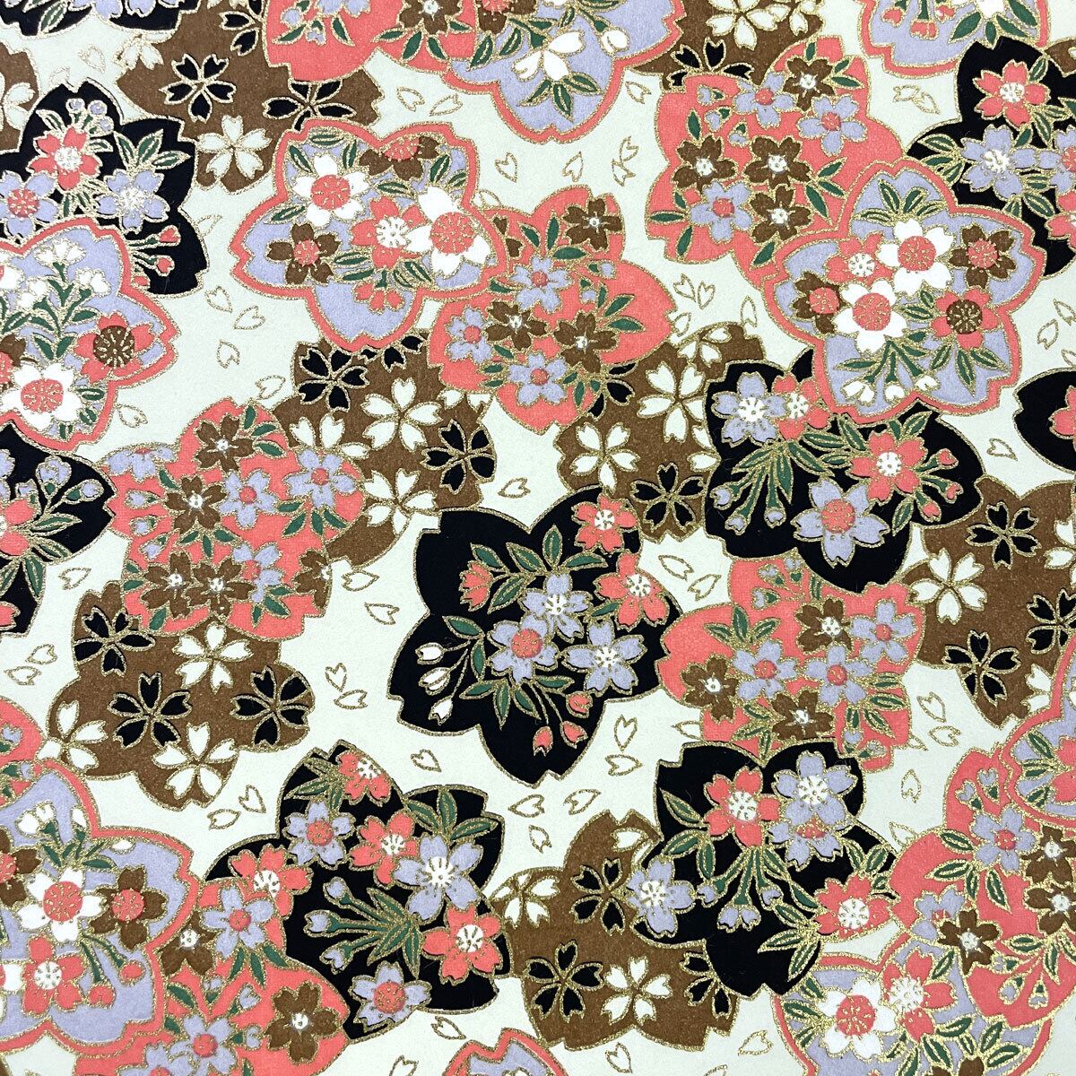 華やかな友禅和紙 桜の花型に桜の花 サーモンピンクと黒 大判 菊判 約63x93cm YUZEN dyeing
