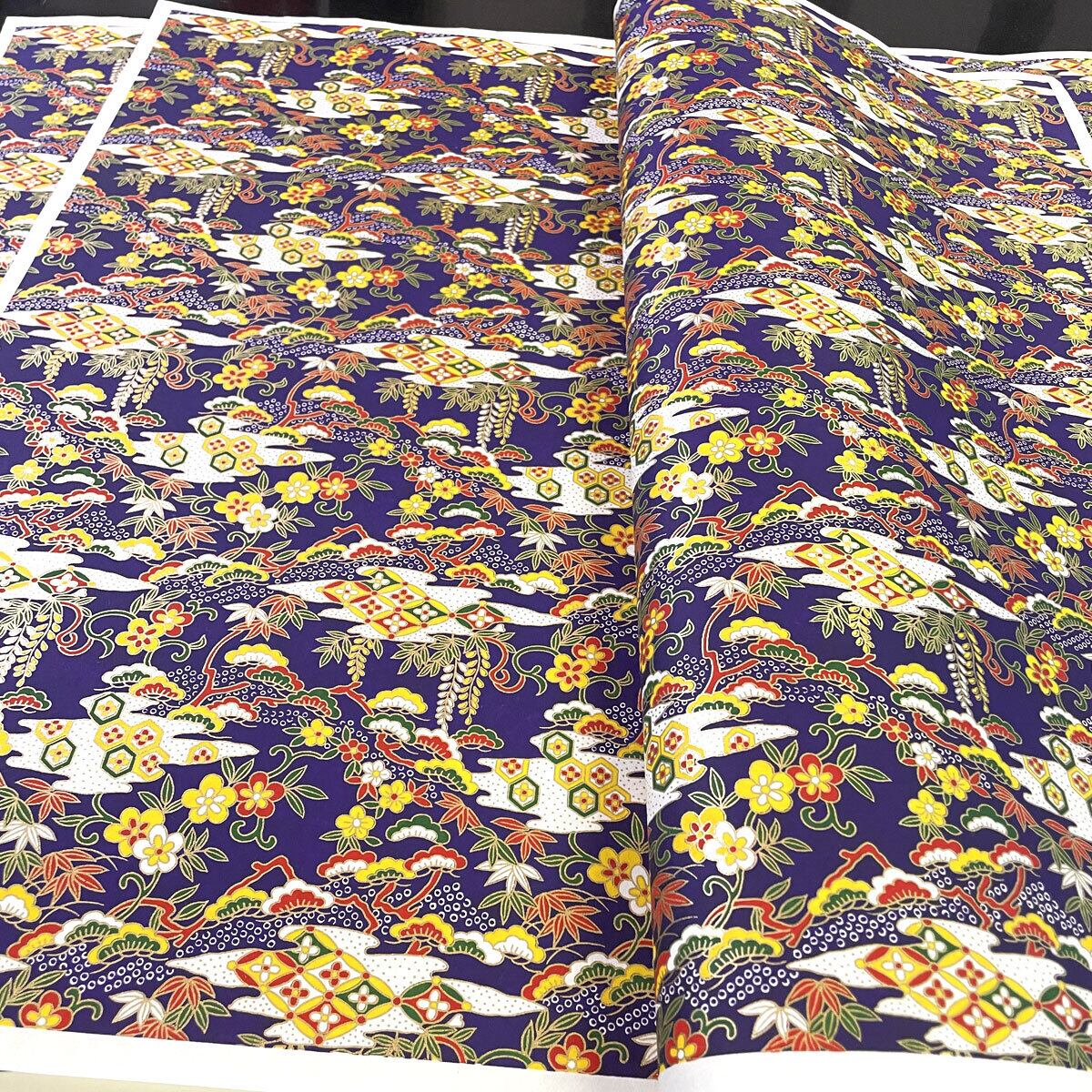華やかな友禅和紙 青色に松竹梅 七宝 古典柄 紫 大判 菊判 約63x93cm YUZEN dyeing