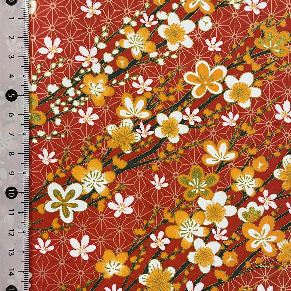 友禅紙 YUZEN dyeing 華やか梅の花 朱色に麻の葉 赤 大判 約63x95㎝