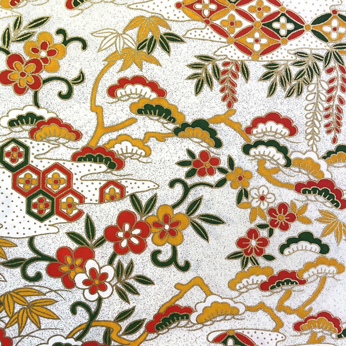 華やかな友禅和紙 白地に松竹梅 七宝 古典柄 パールホワイト 菊判 大判 約63x93cm 千代紙 YUZEN dyeing