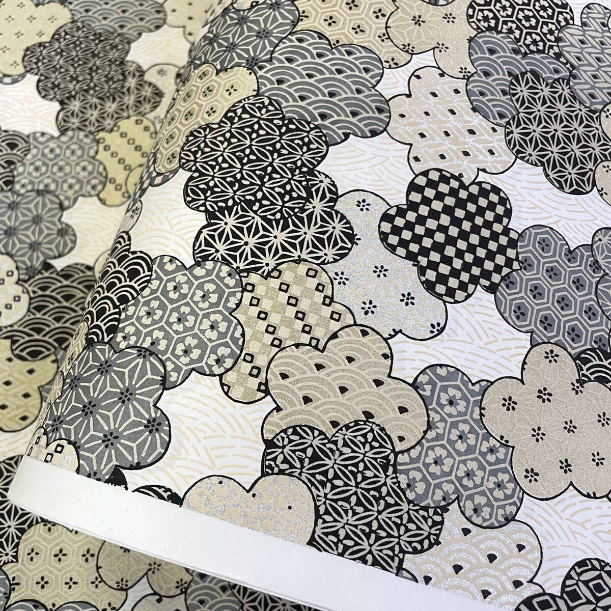 華やかな友禅紙 大きな梅の花 麻の葉 亀甲 青海波紋様 白地に黒 大判 菊判 約63x93cm 千代紙 YUZEN dyeing 81819691