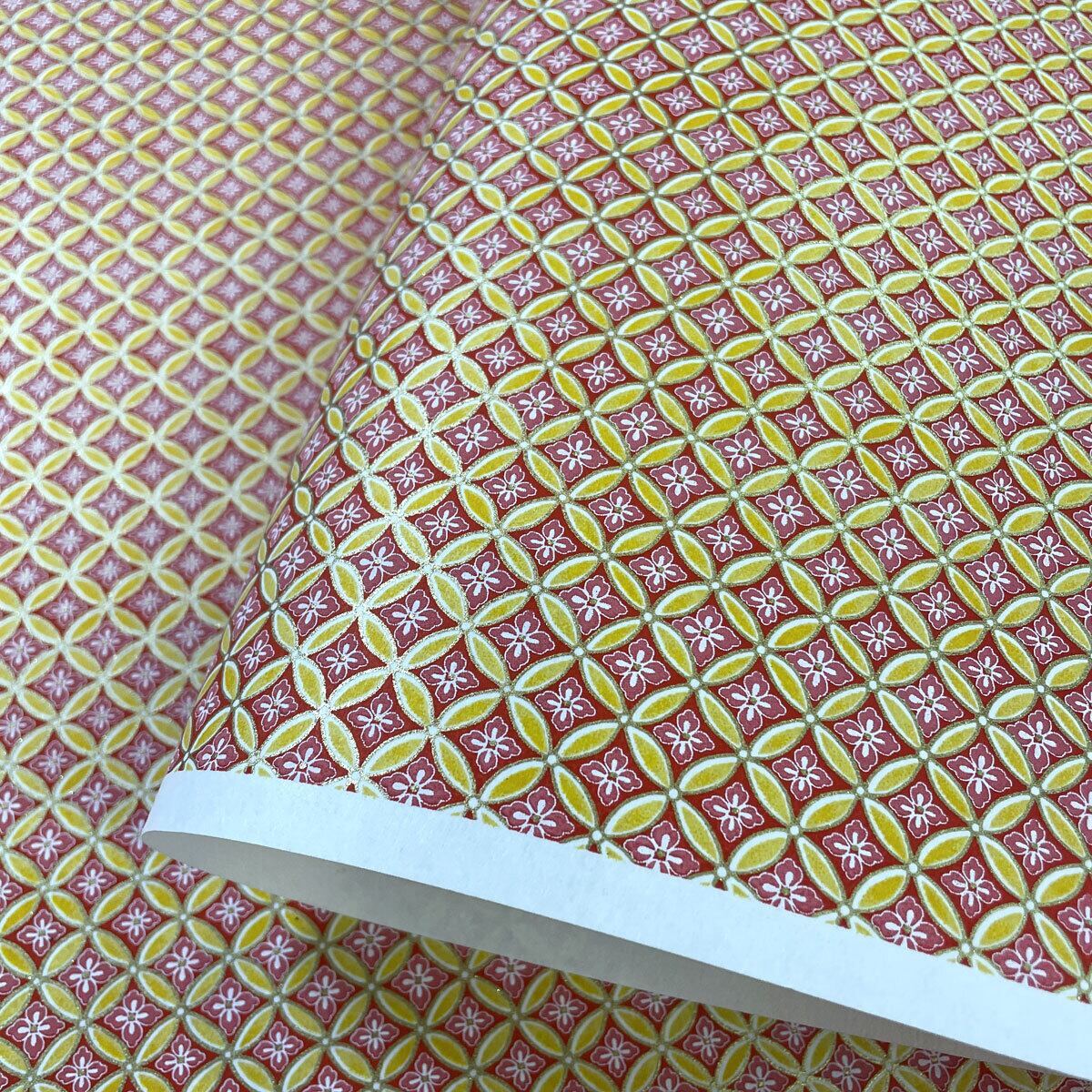 華やかな友禅紙 YUZEN dyeing 小さい七宝に小花柄 黄色 朱色 民芸調 大判 約63x93cm