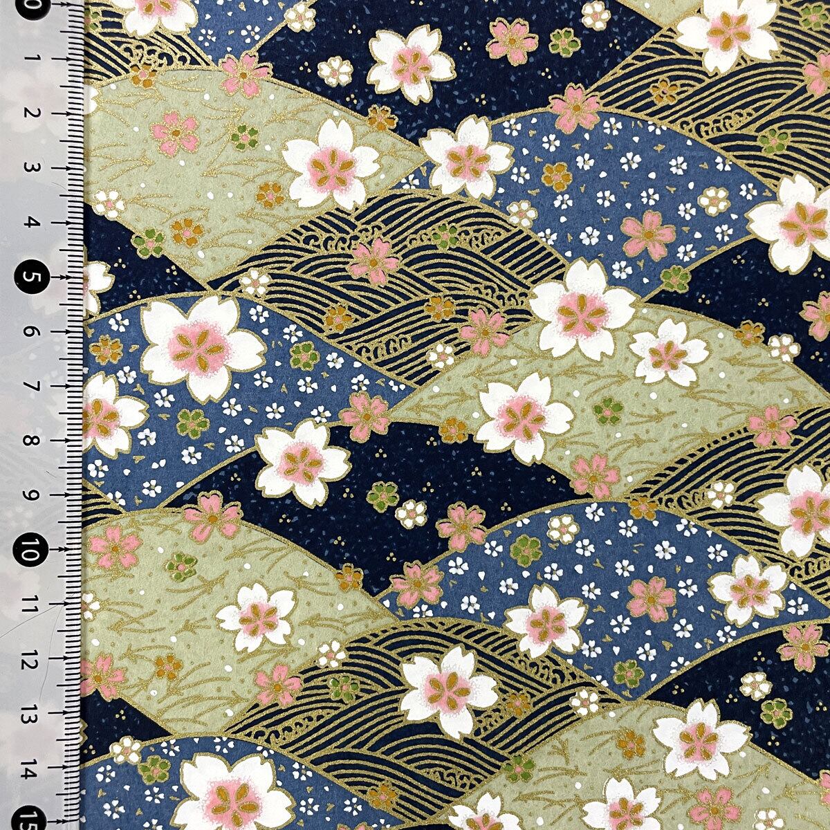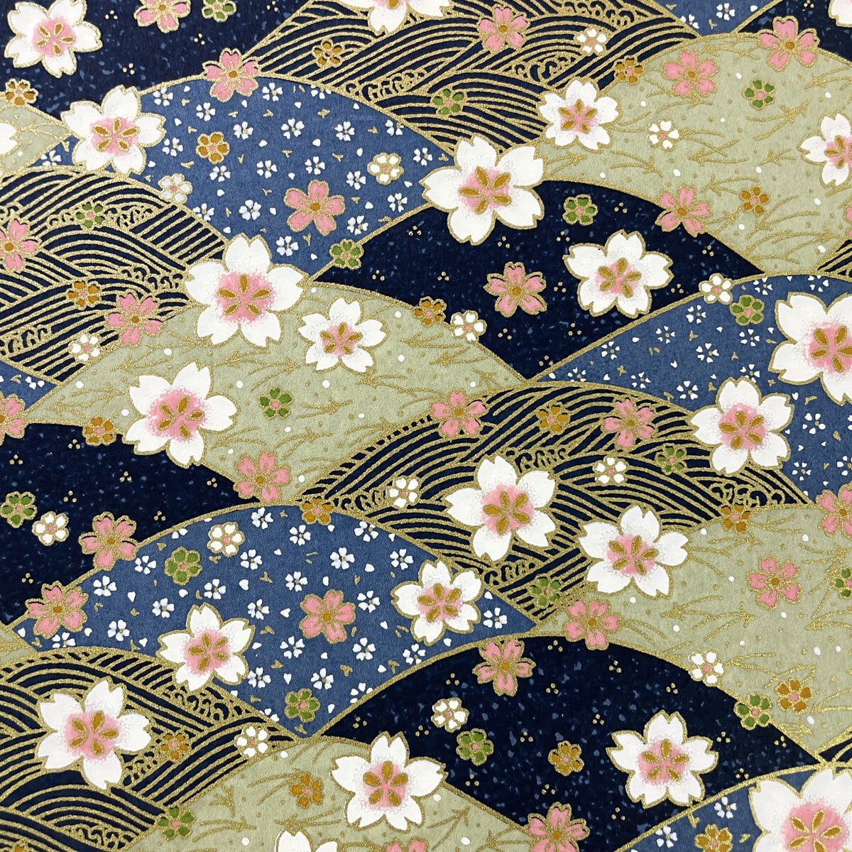 友禅紙 華やかな波と桜 紺 水色 うす緑 大判 菊判 約63x95㎝ 千代紙 YUZEN dyeing 82473131