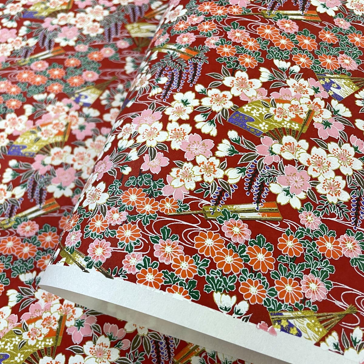 友禅和紙 華やか 桜と扇 菊 藤 赤 大判 菊判 約63x93cm 千代紙 Yuzen Dyeing 82473306