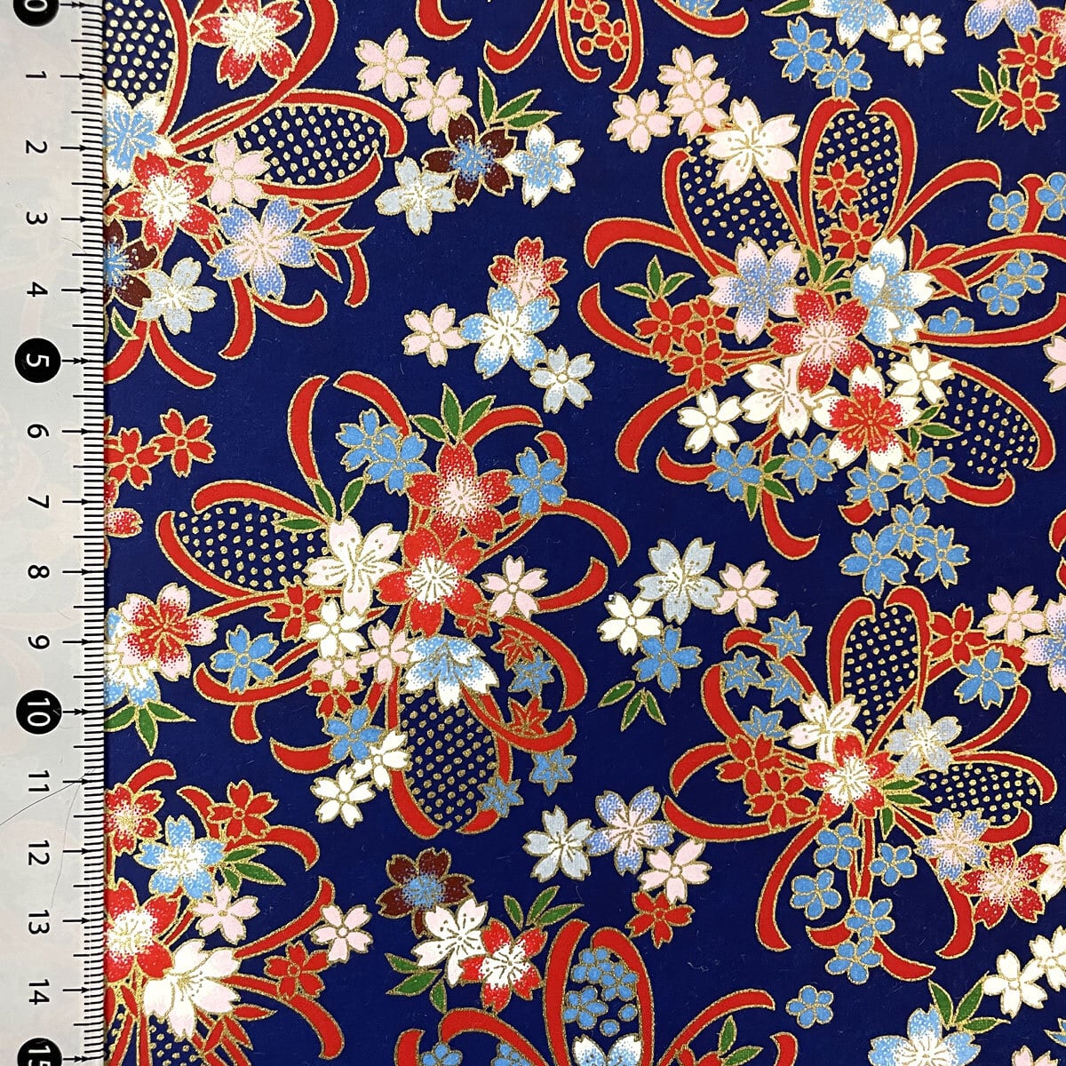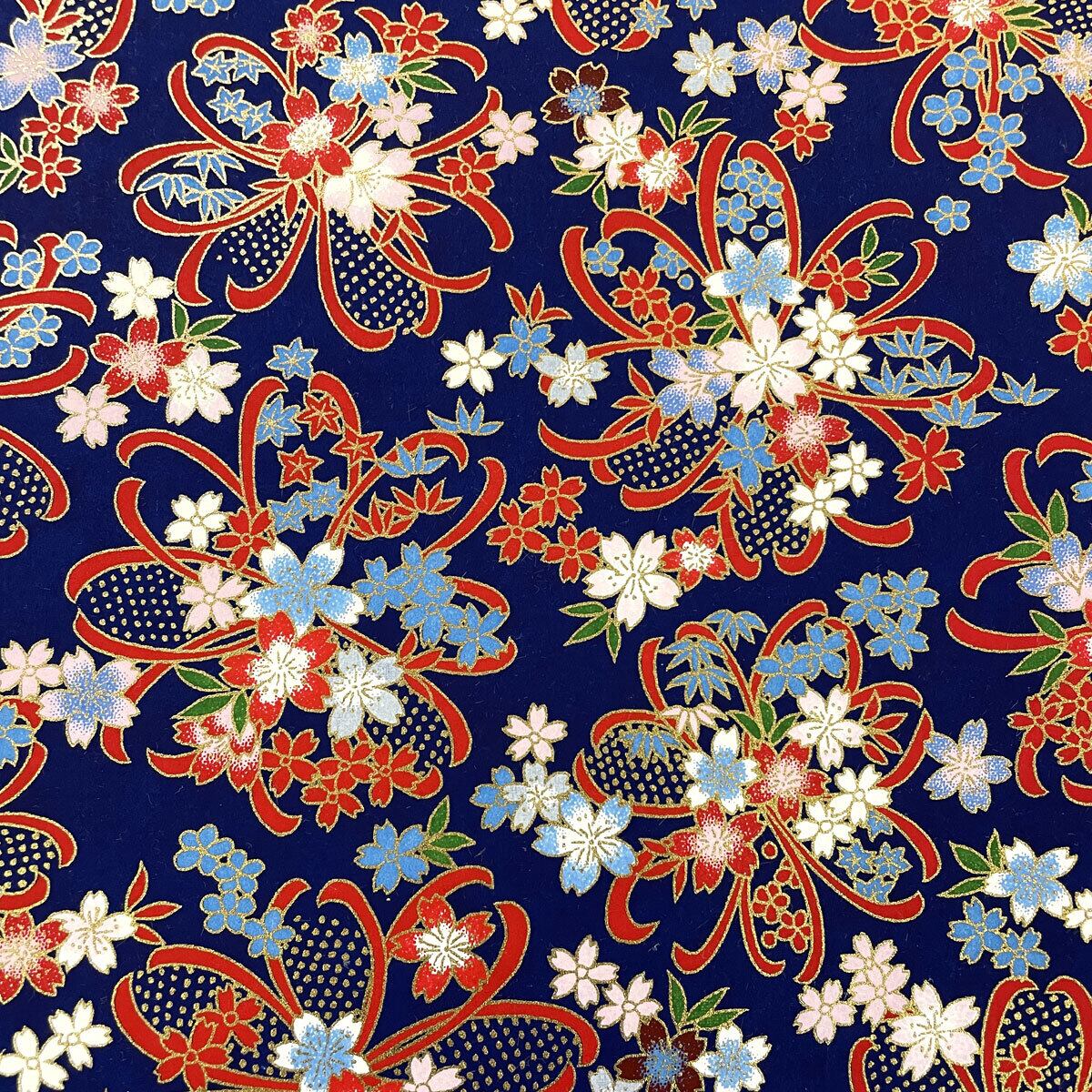 華やかな友禅紙 YUZEN dyeing 赤いリボンと桜 紺地 大判 菊判 約63x93cm 千代紙