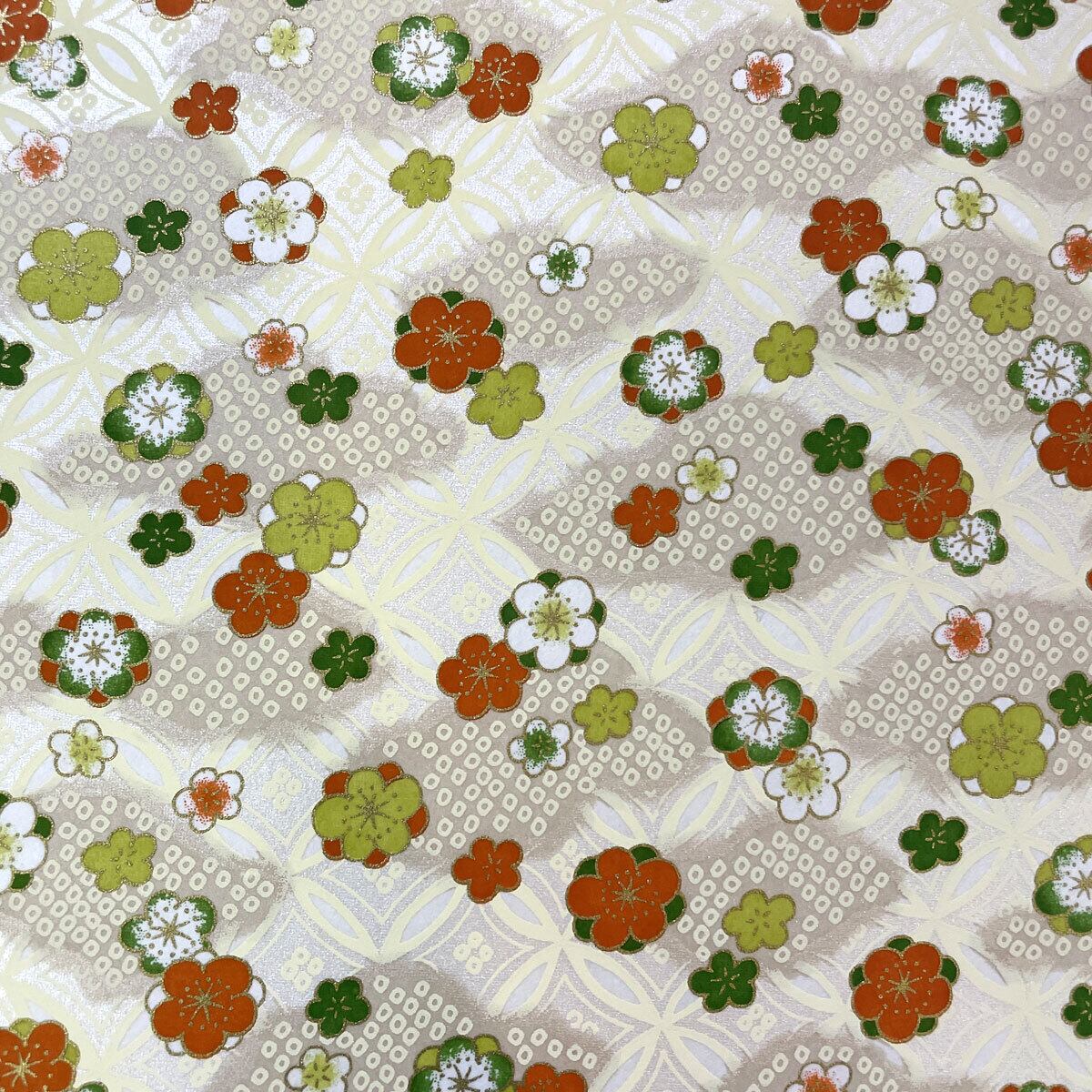 華やかな友禅和紙 七宝の地模様に鹿の子と梅 白地 赤と緑の梅 菊判 大判 約63 x93cm 千代紙 YUZEN dyeing