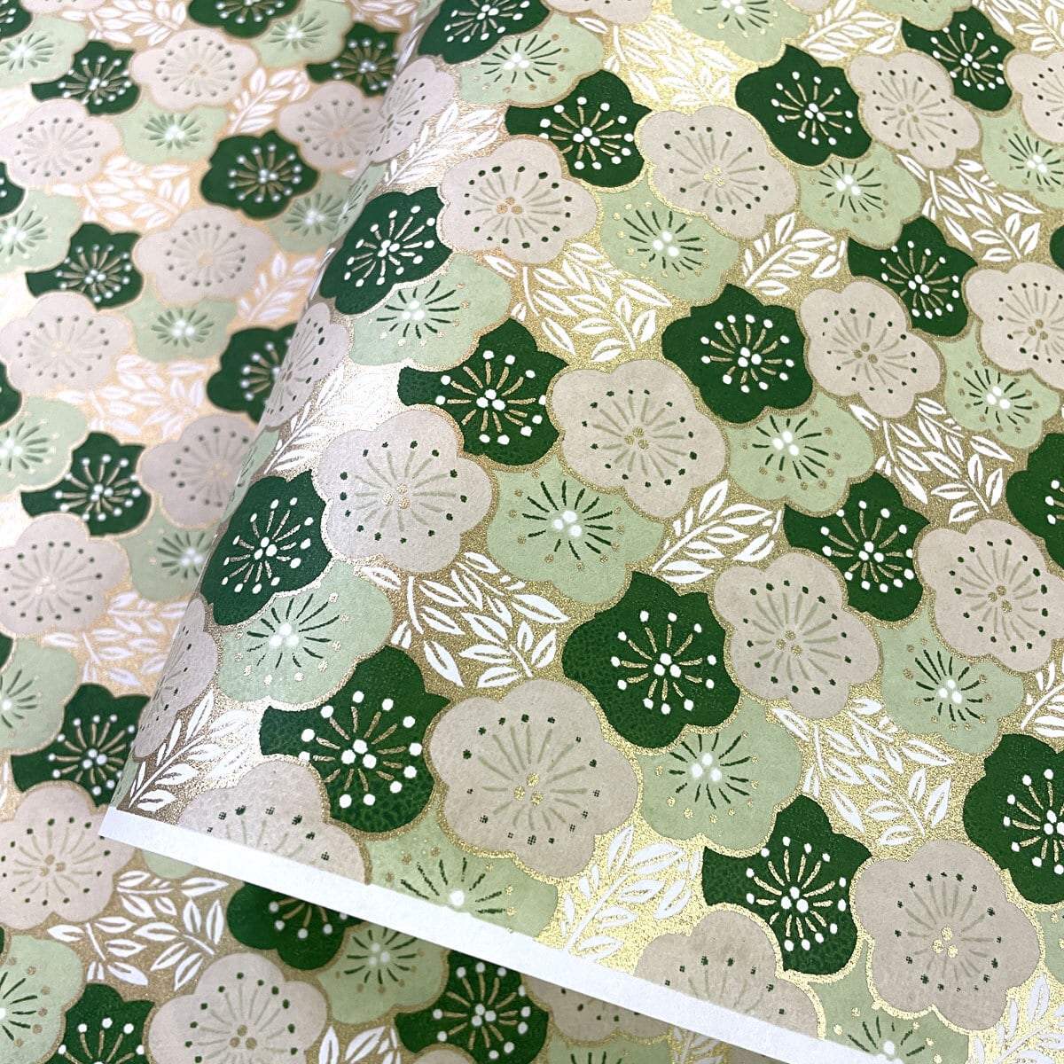 友禅和紙 可愛い梅 深緑 薄緑 金地 大判 約63x93cm 千代紙 YUZEN dyeing