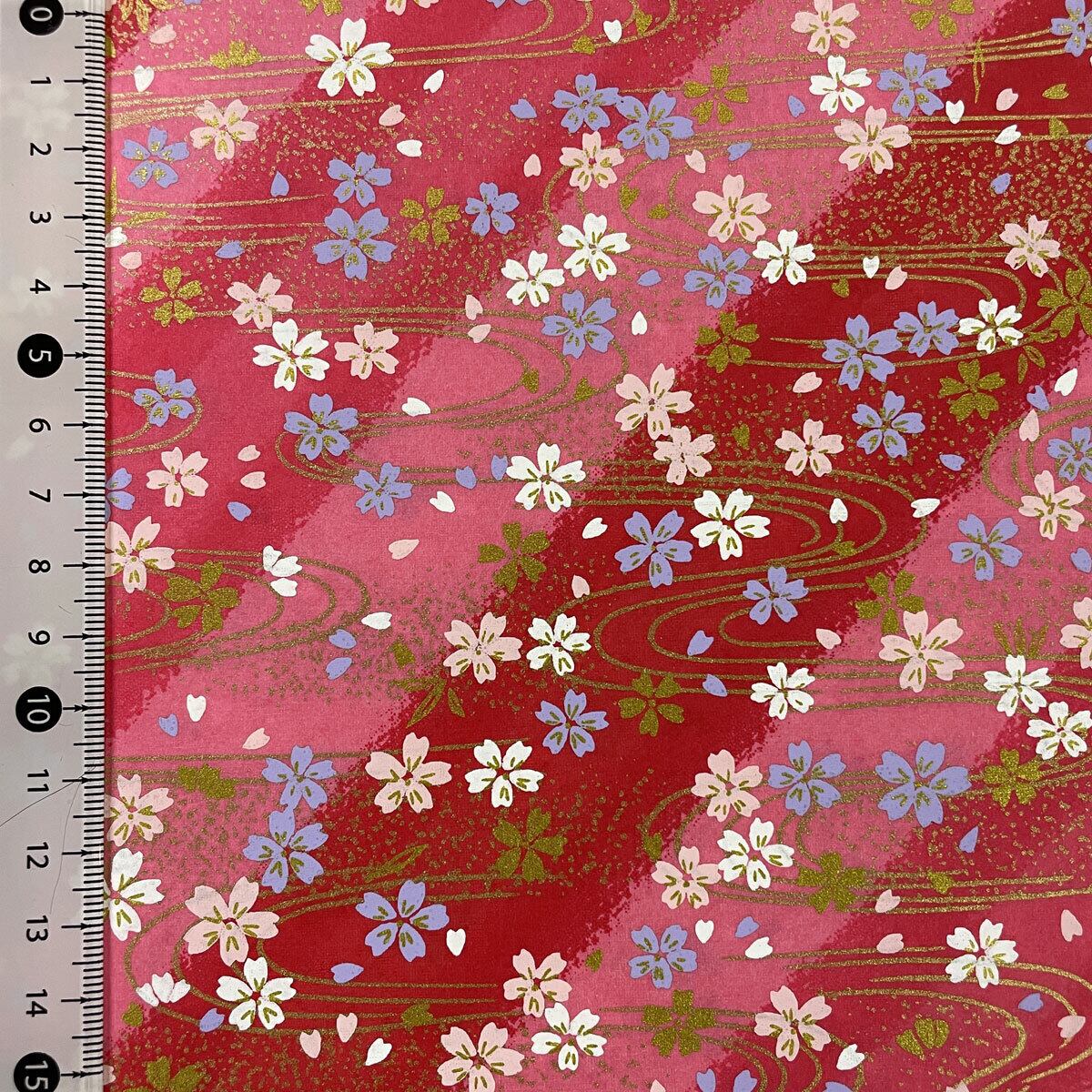 友禅和紙 水面に桜ながし 可愛い 赤地 白と藤色の桜 大判 約63x93cm 千代紙 Yuzen Dyeing