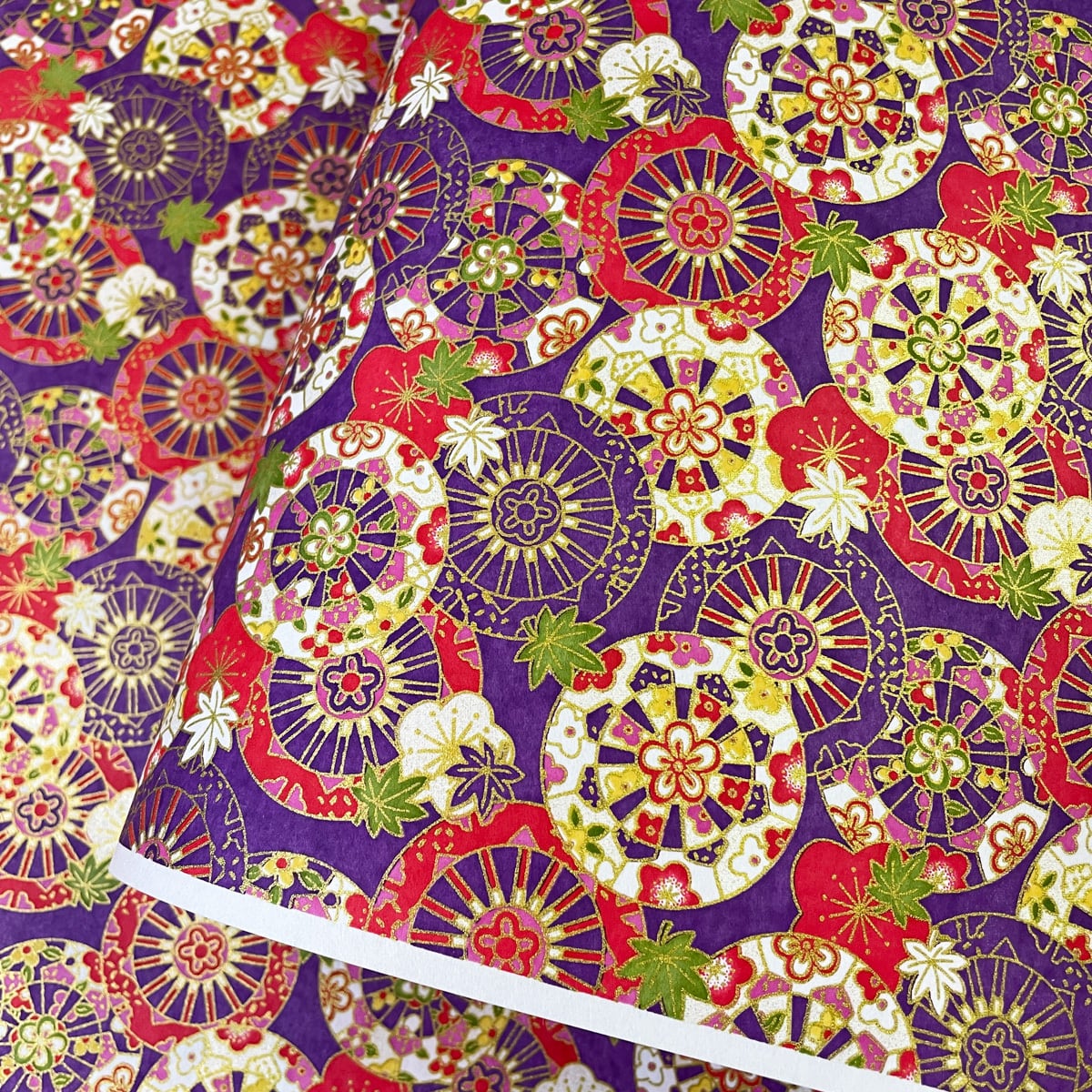 友禅和紙 華やか 源氏車紋 片輪車紋 車輪 御所車 紫地 大判 菊判 約63x93cm 千代紙 Yuzen Dyeing