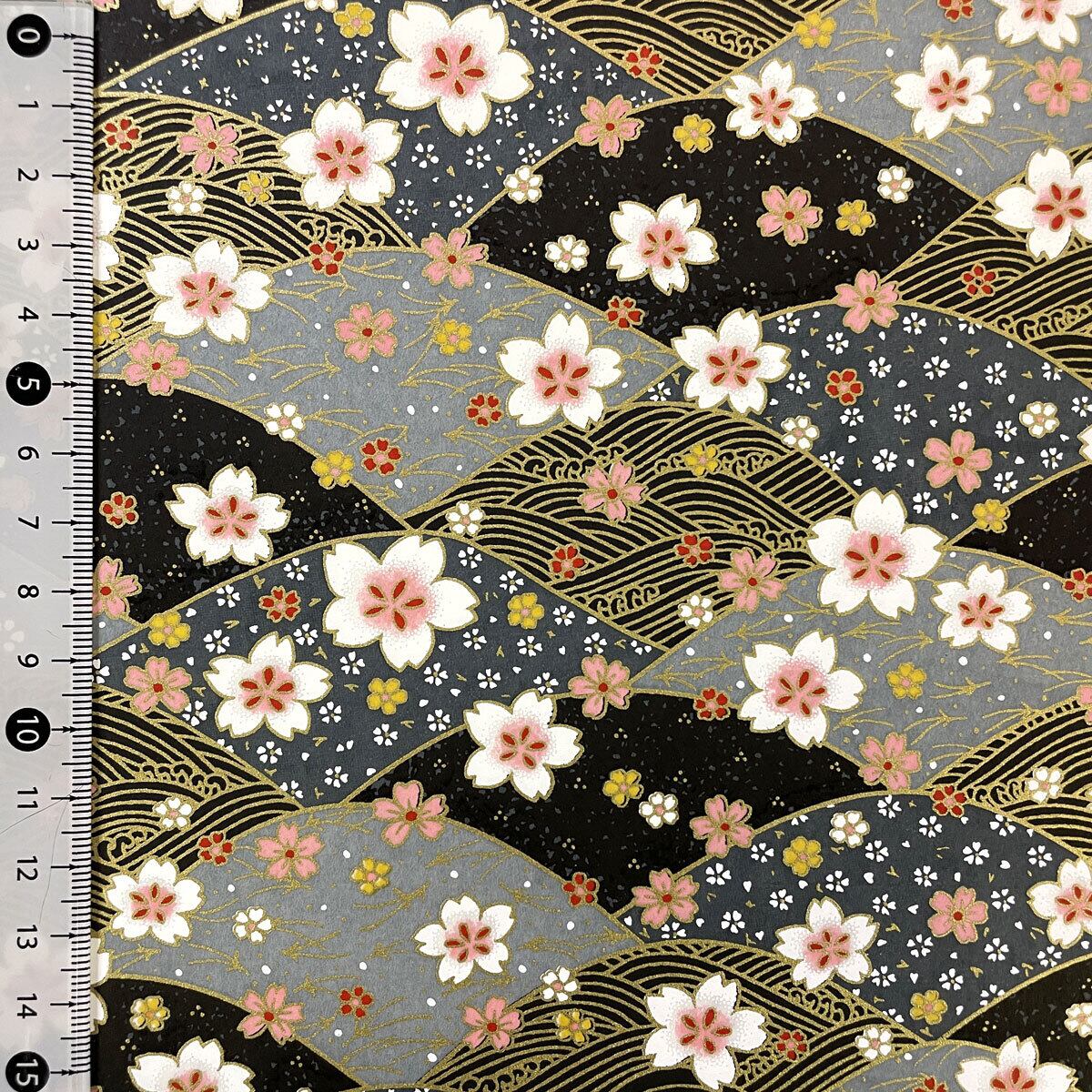 友禅紙 華やかな波と桜 黒 グレイ 大判 約63x93cm 千代紙 Yuzen Dyeing