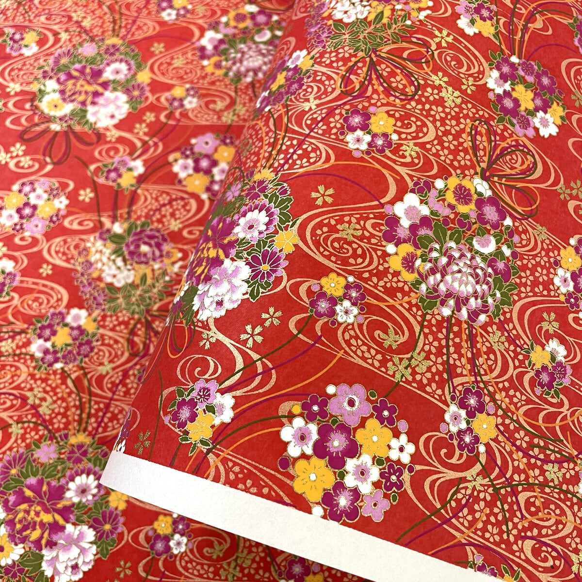 華やかな友禅和紙 牡丹の花束 水引 リボン 赤地に桜と波の背景 大判 約63x93cm 千代紙 Yuzen Dyeing 84639225