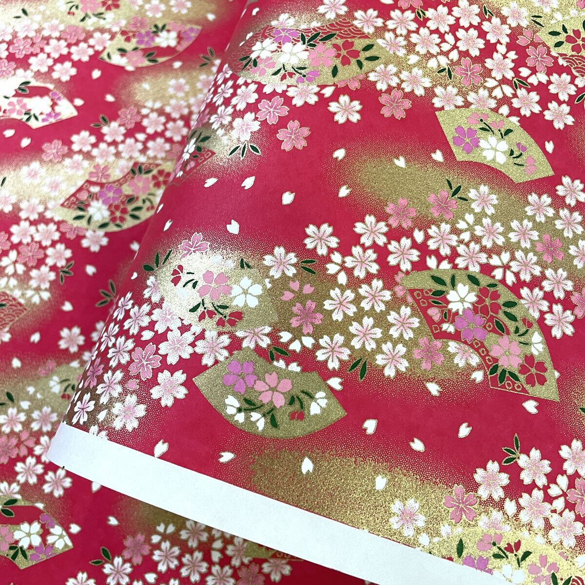 華やかな友禅和紙 金雲に扇と桜 濃い桃色 ビビッドピンク 大判 菊判 約63x93cm 千代紙 Yuzen dyeing