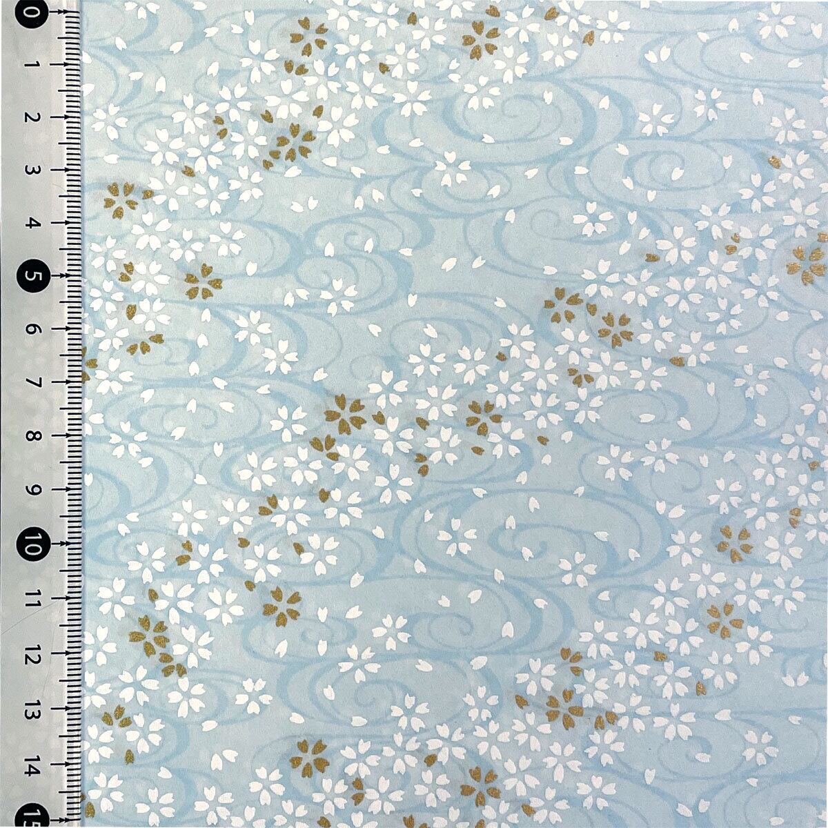 友禅和紙 流水紋に白と金の小桜 花筏 さわやか 水色 大判 約63x93cm 千代紙 Yuzen dyeing