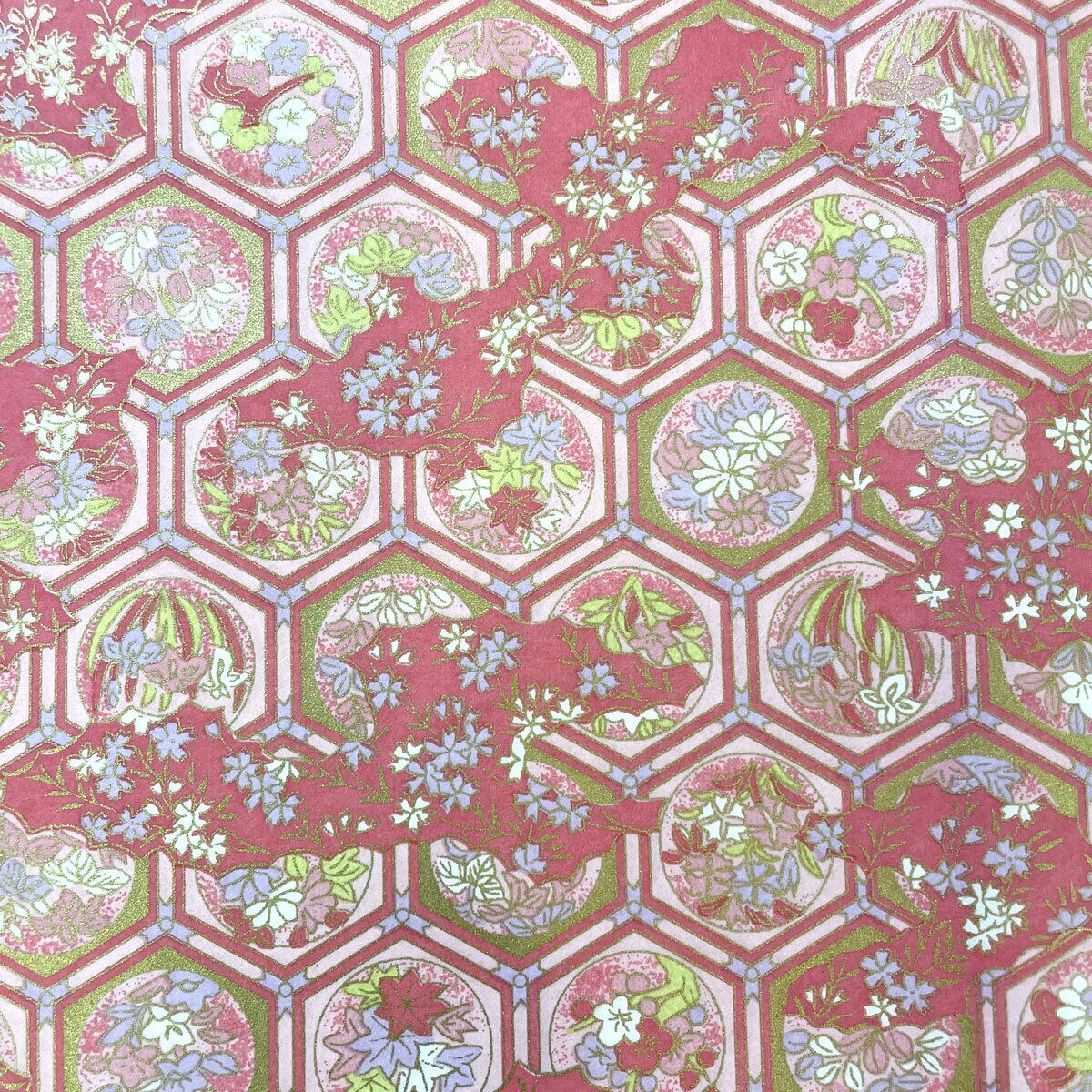 華やかな友禅紙 天井絵風 六角に丸紋様 雲 草花 ピンク 桃色 大判 約63x93cm 千代紙 Yuzen dyeing