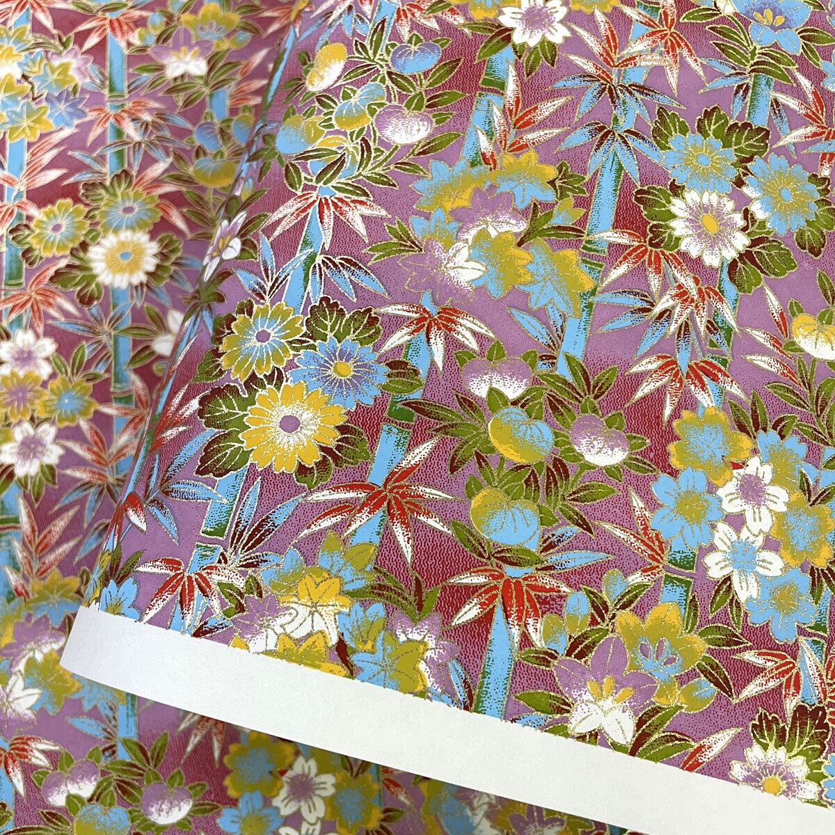 華やかな友禅紙 竹林に季節の花々 菊 橘 紅葉 ローズピンク 大判 約63x93cm 千代紙 YUZEN dyeing 87099072
