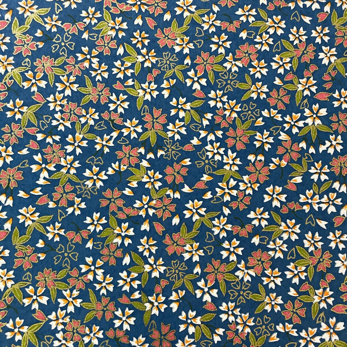 友禅紙 紺地に小花 桜 青緑 可愛い 大判 約63x95㎝ 千代紙 YUZEN dyeing