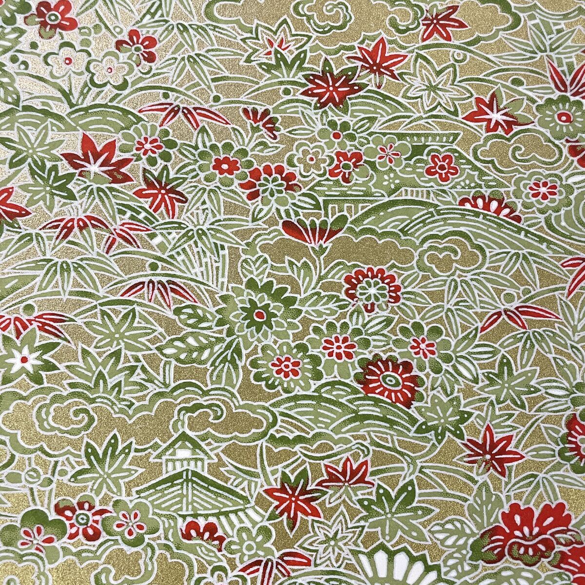友禅和紙 民芸風 紅葉 笹 菊 扇 金地 緑 赤 大判 約63x93cm 千代紙 YUZEN dyeing