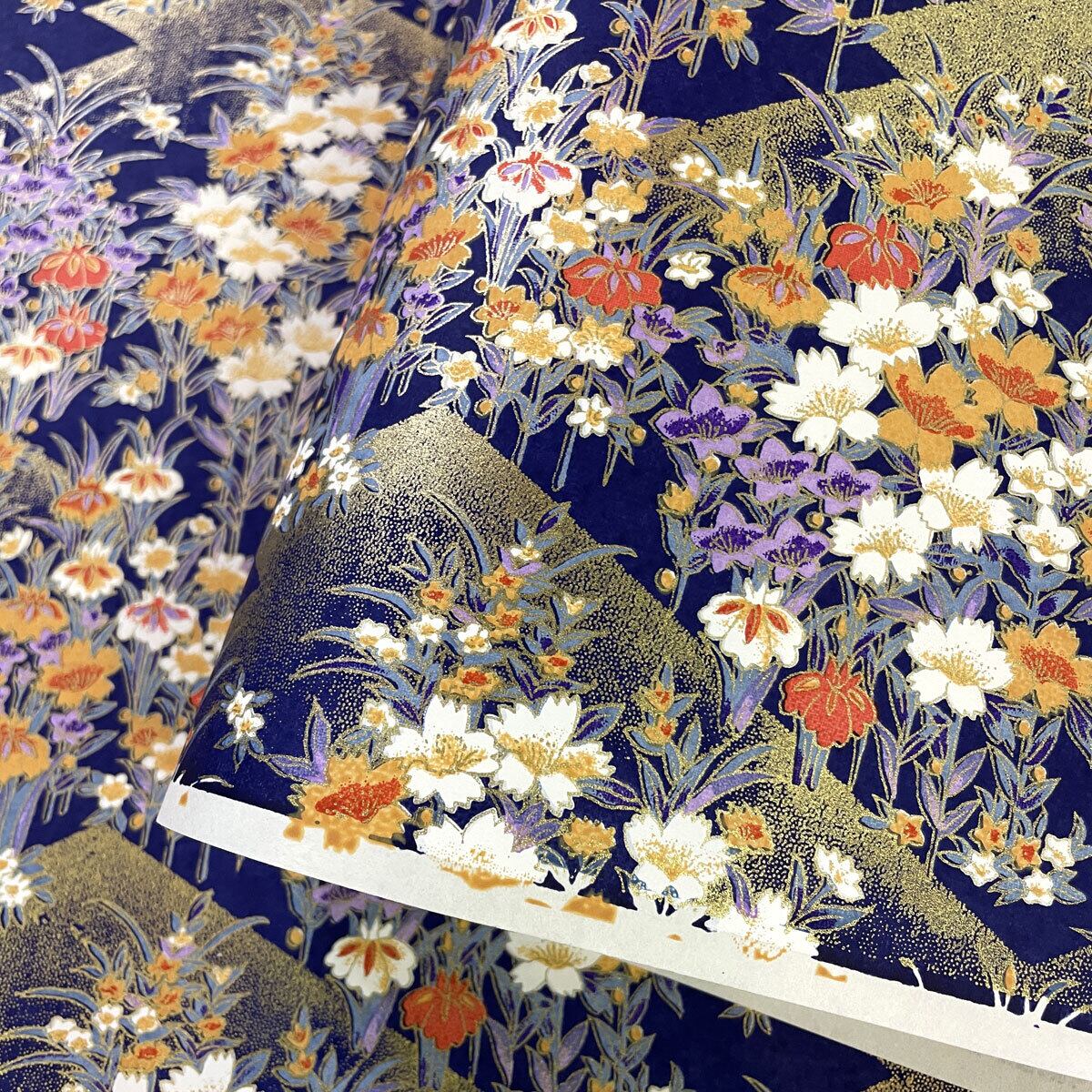 華やかな友禅紙 菖蒲 撫子 初夏の花 紺地 大判 約63x93cm 千代紙 YUZEN dyeing