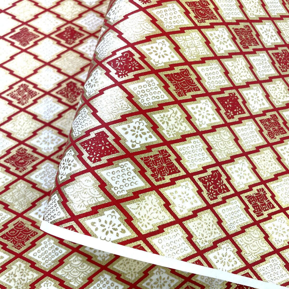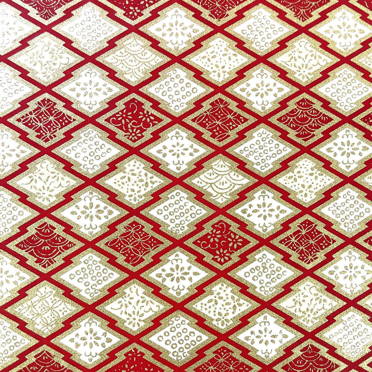 華やかな友禅紙 菱紋様に古典柄 七宝 青海波 白地に赤 大判 約63x93cm 千代紙 YUZEN dyeing