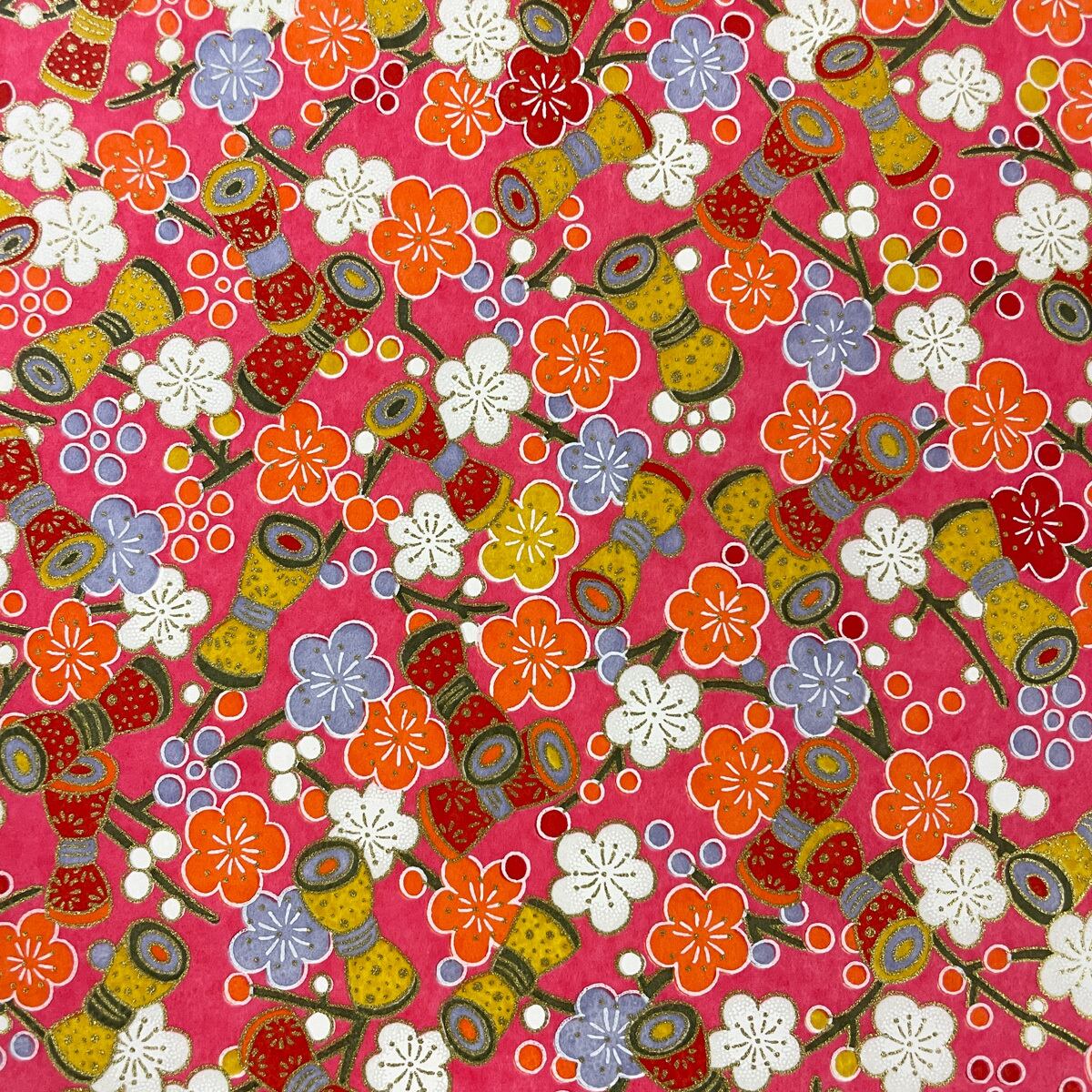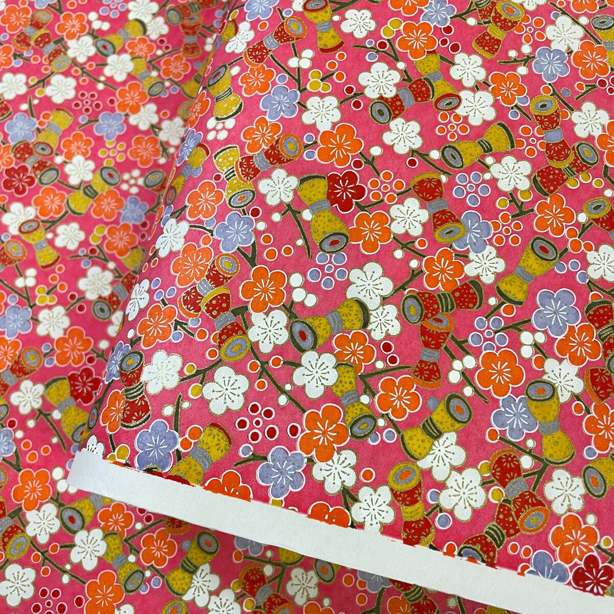 華やかな友禅和紙 紅赤色に紅白梅と巻物 大判 約63x93cm 千代紙 YUZEN dyeing
