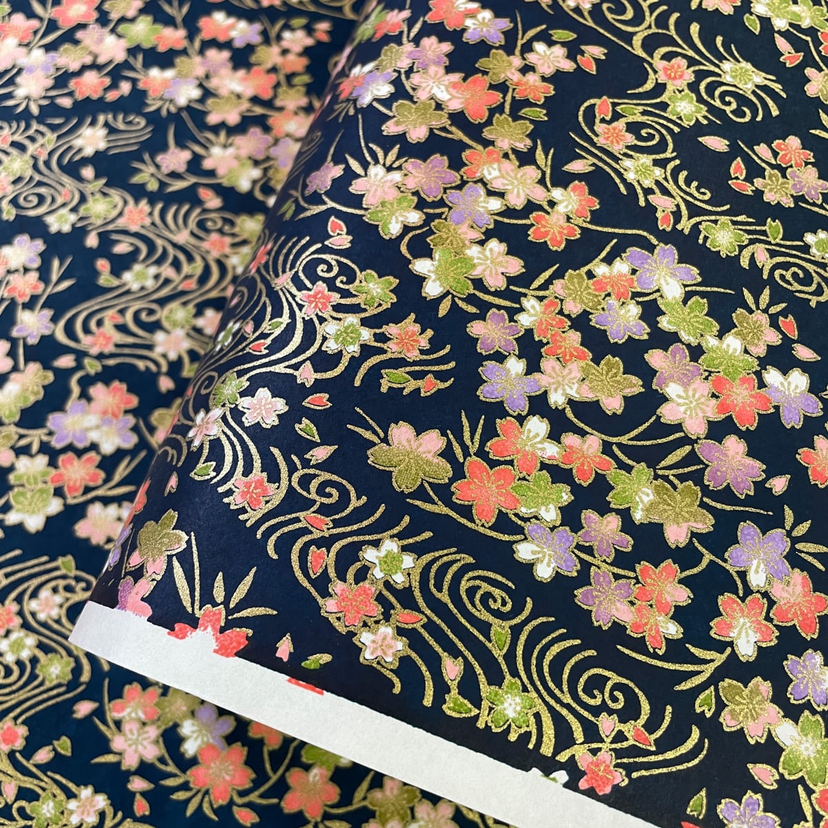 華やかな友禅和紙 金の波にやさしい色の桜 濃い紺 紫 青 大判 約63x93cm 千代紙 YUZEN dyeing 91300459